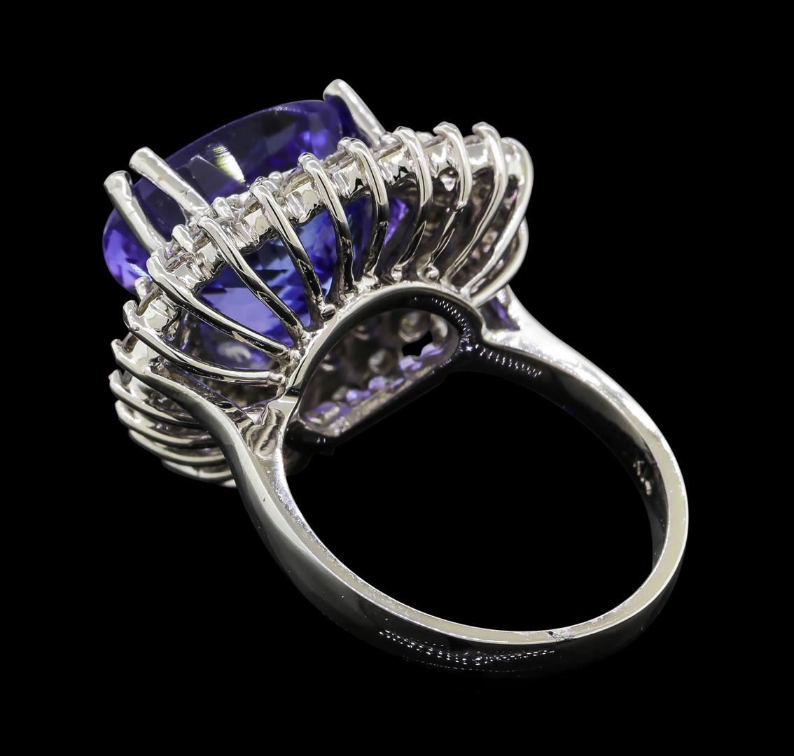 One electronically tested 14KT white gold lady's cast fashion ring with a double basket halo with a bright polish finish. The featured lady's ring has a shank measuring 2.54 millimeters wide. Identified with markings of 'K14'. Condition is new, good workmanship. Containing: One prong set pear modified brilliant cut natural tanzanite, measuring 12.25 x 13.75 x 9.53mm, (depth est.) approximate weight of 10.76ct., clarity is eye clean, medium, moderately strong, violetish blue color, (GIA vB 5/4), cut is very good. Transmitting light with no distortion, transparent. Colored gemstones are presumed to have been subjected to commonly used enhancement processes. Graded in the setting. Twenty-Four prong set round brilliant cut diamonds, measuring 2.40 - 2.30 x 1.46mm (depth est.) approximate total weight of 24 Stones = 1.17ct. Graded in the setting. Clarity SI-1 to I-1. Color: G - H Cut Very Good Twenty-One prong set round brilliant cut diamonds, measuring 2.10 - 2.00 x 1.25mm (depth est.) approximate total weight of 21 Stones = 0.68ct. Graded in the setting. Clarity SI-1 to I-1. Color: G - H Cut Good. Total Weight of Colored Stones 10.76ct.. Total Weight of Diamonds 1.85ct.. Total Weight of Ring 10.20gm. GAS Appraised at $18,905.00.
