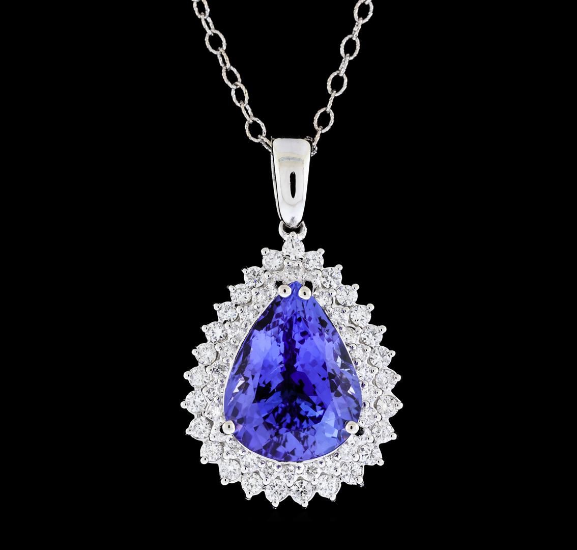 One electronically tested 14KT white gold lady's combination cast & assembled fashion pendant & chain 18.0' long, 1.9mm twisted oval shape link with a lobster claw clasp with a double basket halo with a bright polish finish. Identified with markings of '14K'. Condition is new, good workmanship. Containing: One prong set pear modified brilliant cut natural tanzanite, measuring 16.57 x 12.70 x 8.58mm, (depth est.) approximate weight of 10.79ct., clarity is eye clean, medium, moderately strong, violetish blue color, (GIA vB 5/4), cut is very good. Transmitting light with no distortion, transparent. Colored gemstones are presumed to have been subjected to commonly used enhancement processes. Graded in the setting. Twenty-Seven prong set round brilliant cut diamonds, measuring 2.05 - 1.95 x 1.24mm (depth est.) approximate total weight of 27 Stones = 0.83ct. Graded in the setting. Clarity SI-1 to SI-2. Color: G - H Cut Good Twenty-Six prong set round brilliant cut diamonds, measuring 1.80 - 1.70 x 1.07mm (depth est.) approximate total weight of 26 Stones = 0.52ct. Graded in the setting. Clarity SI-1 to SI-2. Color: G - H Cut Good. Total Weight of Colored Stones 10.79ct.. Total Weight of Diamonds 1.35ct.. Total Weight of Pendant & Chain 10.60gm. GAS Appraised at $19,915.00.