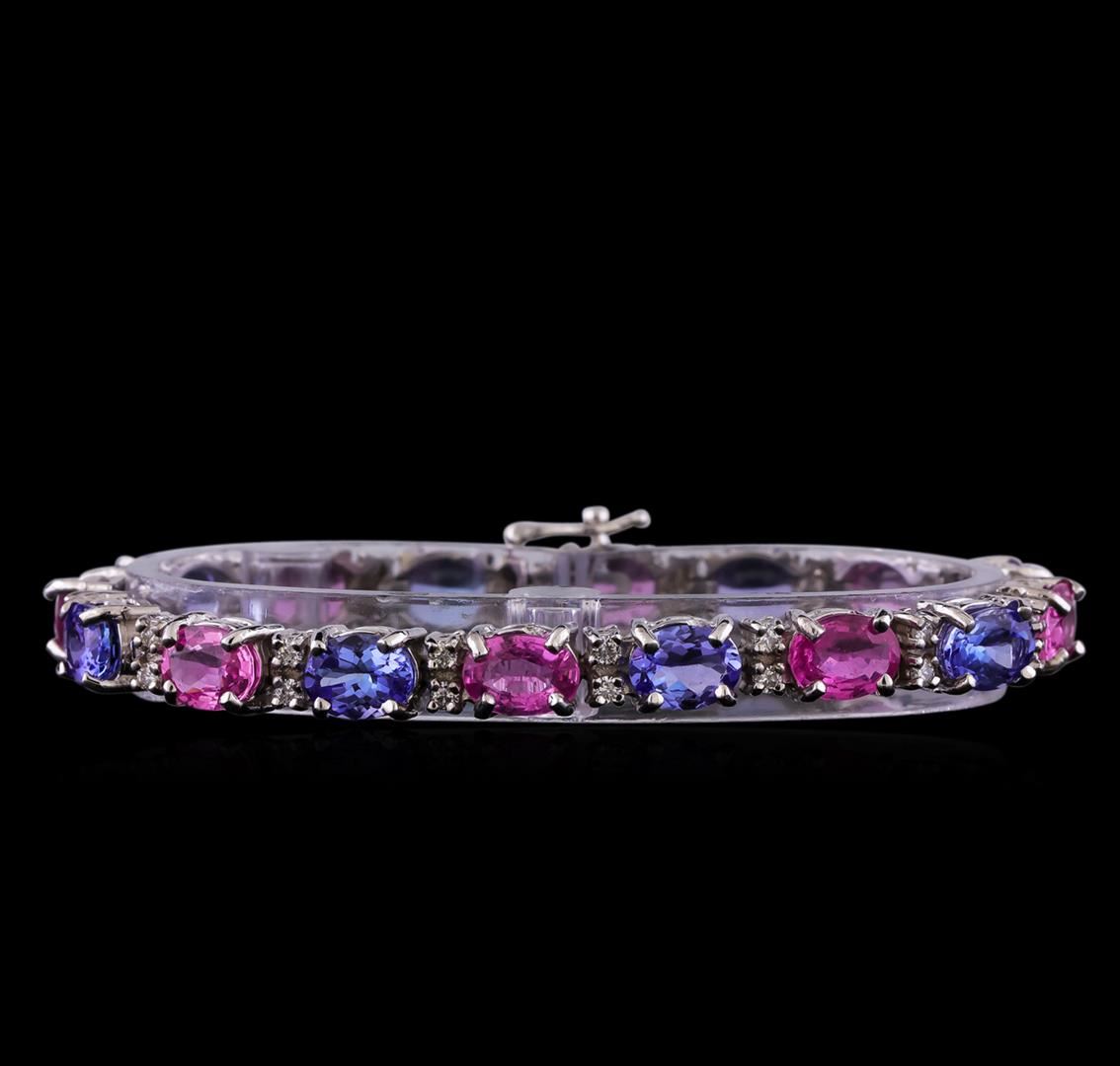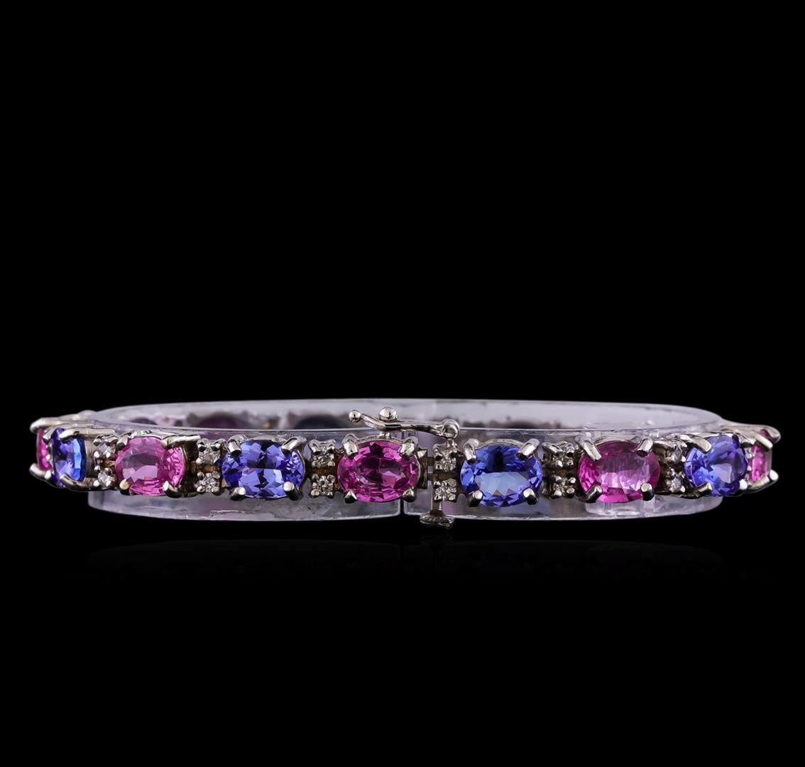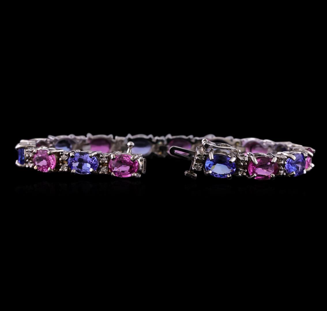 One electronically tested 14KT white gold lady's combination cast & assembled straight line fashion bracelet with a tongue clasp with fold over safety with a bright polish finish. The featured lady's bracelet measures 7 inches in length. Identified with markings of "14K". Condition is new, good workmanship. Containing: Eight prong set oval modified brilliant cut natural pink sapphires, measuring 7.95 x 6.05 x 3.10mm, (depth est.) 5%. bulge factor, approximate total weight of 10.52ct., clarity is slightly included, medium, moderately strong, slightly purplish red color, (GIA slpR 5/4), cut is good. Transmitting light with a minimum of distortion, transparent. Colored gemstones are presumed to have been subjected to commonly used enhancement processes. Graded in the setting. Eight prong set oval modified brilliant cut natural tanzanites, measuring 8.05 x 6.00 x 3.95mm, (depth est.) approximate total weight of 10.80ct., clarity is eye clean, medium, moderately strong, bluish violet color, (GIA bV 5/4), cut is good. Transmitting light with no distortion, transparent. Colored gemstones are presumed to have been subjected to commonly used enhancement processes. Graded in the setting. Thirty-Two prong set round brilliant cut diamonds, measuring 2.10 - 2.00 x 1.23mm (depth est.) approximate total weight of 32 Stones = 1.00ct. Graded in the setting. Clarity: VS-2 to SI-2. Color: H - I. Cut Good. Total Weight of Colored Stones 21.32ct. Total Weight of Diamonds 1.00ct. Total Weight of Bracelet 21.40gm. GAS Appraised at $27,760.00.