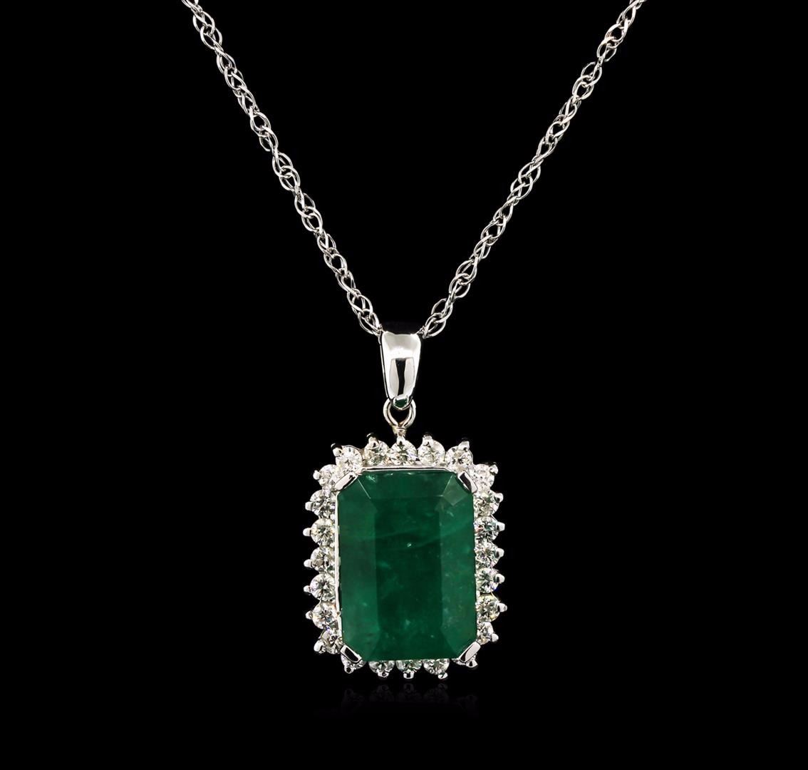 One electronically tested 14KT white gold lady's combination cast & assembled fashion pendant & chain 18.0" long, 1.5mm diamond cut loose rope chain with a spring ring clasp with a basket halo with a bright polish finish. Identified with markings of "14K". Condition is new, good workmanship. Containing: One prong set emerald step cut natural emerald, measuring 16.30 x 11.74 x 6.88mm, 10% bulge factor, approximate weight of 10.81ct., clarity is heavily included, type III, dark, very slightly grayish, very slightly bluish green color, (GIA vslbG 7/3), cut is good. Transmitting light somewhat diffusely, transparent to translucent. Naturally occurring internal & external characteristics are present. Indications of oil residue. Graded in the setting. Twenty-Four prong set round brilliant cut diamonds, measuring 2.40 - 2.35 x 1.48mm (depth est.) approximate total weight of 24 Stones = 1.22ct. Graded in the setting. Clarity: SI-1 to I-1. Color: G - H. Cut Good. Total Weight of Colored Stones 10.81ct. Total Weight of Diamonds 1.22ct. Total Weight of Pendant & Chain 11.80gm. GAS Appraised at $13,620.00.