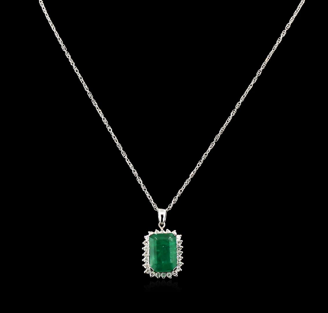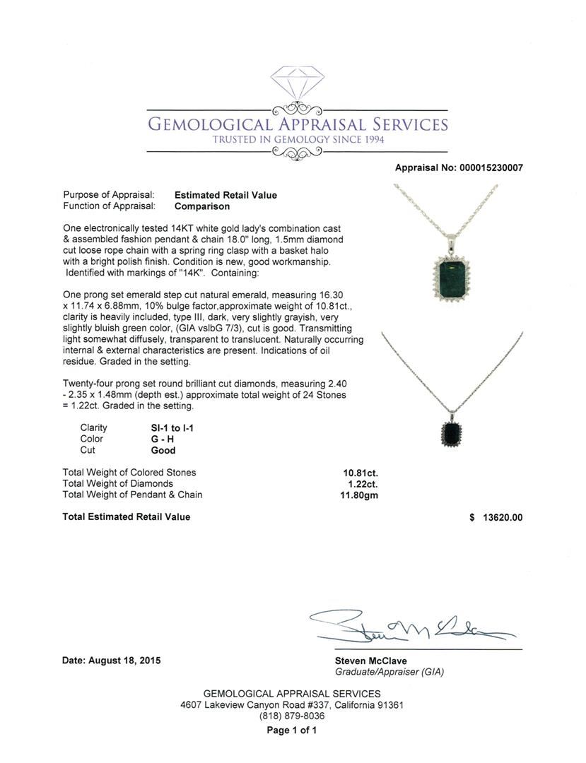 One electronically tested 14KT white gold lady's combination cast & assembled fashion pendant & chain 18.0" long, 1.5mm diamond cut loose rope chain with a spring ring clasp with a basket halo with a bright polish finish. Identified with markings of "14K". Condition is new, good workmanship. Containing: One prong set emerald step cut natural emerald, measuring 16.30 x 11.74 x 6.88mm, 10% bulge factor, approximate weight of 10.81ct., clarity is heavily included, type III, dark, very slightly grayish, very slightly bluish green color, (GIA vslbG 7/3), cut is good. Transmitting light somewhat diffusely, transparent to translucent. Naturally occurring internal & external characteristics are present. Indications of oil residue. Graded in the setting. Twenty-Four prong set round brilliant cut diamonds, measuring 2.40 - 2.35 x 1.48mm (depth est.) approximate total weight of 24 Stones = 1.22ct. Graded in the setting. Clarity: SI-1 to I-1. Color: G - H. Cut Good. Total Weight of Colored Stones 10.81ct. Total Weight of Diamonds 1.22ct. Total Weight of Pendant & Chain 11.80gm. GAS Appraised at $13,620.00.