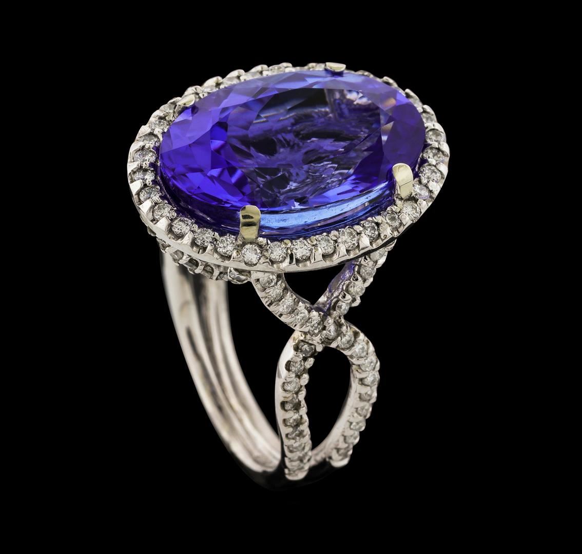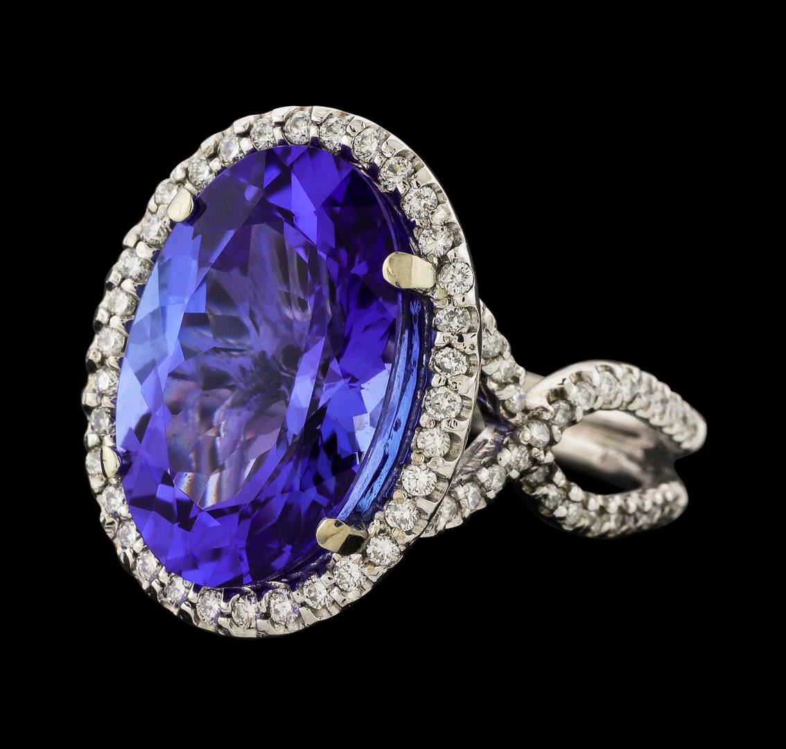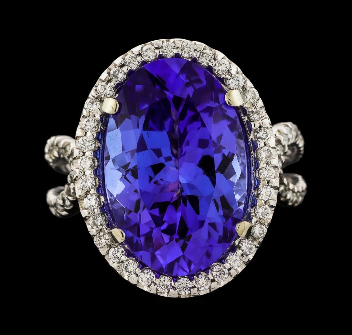 One electronically tested 14KT white gold lady's cast fashion ring with a split crossover shank with halo with a bright polish finish. The featured lady's ring has a double shank measuring 3.20 millimeters wide. Identified with markings of '14K'. Condition is new, good workmanship. Containing: One prong set oval modified brilliant cut natural tanzanite, measuring 17.22 x 11.25 x 7.95mm, (depth est.) approximate weight of 10.85ct., clarity is eye clean, medium, moderately strong, bluish violet color, (GIA bV 5/4), cut is very good. Transmitting light with no distortion, transparent. Colored gemstones are presumed to have been subjected to commonly used enhancement processes. Graded in the setting. Thirty-Four prong set round brilliant cut diamonds, measuring 1.40 - 1.35 x 0.86mm (depth est.) approximate total weight of 34 Stones = 0.34ct. Graded in the setting. Clarity SI-1 to SI-2. Color: G - H Cut Good Ninety-Four prong set round brilliant cut diamonds, measuring 1.20 - 1.15 x 0.73mm (depth est.) approximate total weight of 94 Stones = 0.57ct. Graded in the setting. Clarity SI-1 to SI-2. Color: G - I Cut Good. Total Weight of Colored Stones 10.85ct.. Total Weight of Diamonds 0.91ct.. Total Weight of Ring 9.50gm. GAS Appraised at $19,005.00.