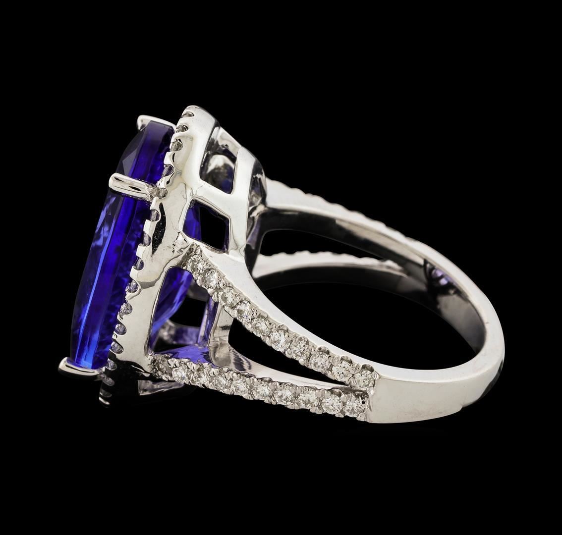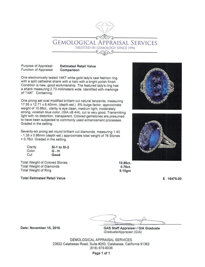 One electronically tested 14KT white gold lady's cast fashion ring with a split cathedral shank with a halo with a bright polish finish. The featured lady's ring has a shank measuring 2.73 millimeters wide. Identified with markings of '14K'. Condition is new, good workmanship. Containing: One prong set oval modified brilliant cut natural tanzanite, measuring 17.55 x 12.71 x 6.40mm, (depth est.) 8%. bulge factor, approximate weight of 10.86ct., clarity is eye clean, medium light, moderately strong, violetish blue color, (GIA vB 4/4), cut is very good. Transmitting light with no distortion, transparent. Colored gemstones are presumed to have been subjected to commonly used enhancement processes. Graded in the setting. Seventy-Six prong set round brilliant cut diamonds, measuring 1.40 - 1.35 x 0.86mm (depth est.) approximate total weight of 76 Stones = 0.76ct. Graded in the setting. Clarity SI-1 to SI-2. Color: G - H Cut Good. Total Weight of Colored Stones 10.86ct.. Total Weight of Diamonds 0.76ct.. Total Weight of Ring 9.10gm. GAS Appraised.