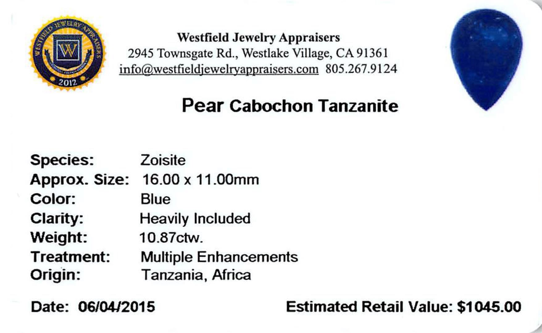 One pear cabochon cut natural tanzanite, measuring 16.00 x 11.00 x 8.00mm, exact weight 10.87ct., clarity is heavily included, type I, dark, moderately strong, blue color, (GIA B 7/4), cut is good. Transmitting light somewhat diffusely, transparent to translucent. Naturally occurring internal & external characteristics are present. Indications of heat treatment. Westfield Appraised at $1,045.00.