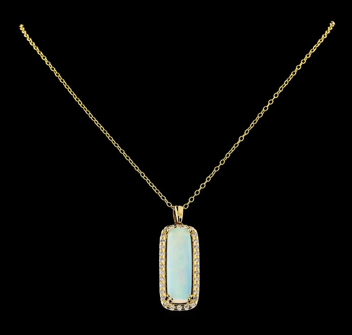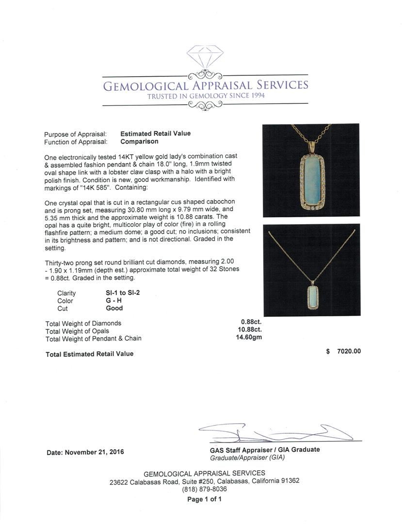 One electronically tested 14KT yellow gold lady's combination cast & assembled fashion pendant & chain 18.0' long, 1.9mm twisted oval shape link with a lobster claw clasp with a halo with a bright polish finish. Identified with markings of '14K 585'. Condition is new, good workmanship. Containing: One crystal opal that is cut in a rectangular cus shaped cabochon and is prong set, measuring 30.80 mm long x 9.79 mm wide, and 5.35 mm thick and the approximate weight is 10.88 carats. The opal has a quite bright, multicolor play of color (fire) in a rolling flashfire pattern; a medium dome; a good cut; no inclusions; consistent in its brightness and pattern; and is not directional. Graded in the setting. Thirty-Two prong set round brilliant cut diamonds, measuring 2.00 - 1.90 x 1.19mm (depth est.) approximate total weight of 32 Stones = 0.88ct. Graded in the setting. Clarity SI-1 to SI-2. Color: G - H Cut Good. Total Weight of Diamonds 0.88ct.. Total Weight of Opals 10.88ct.. Total Weight of Pendant & Chain 14.60gm. GAS Appraised at $7,020.00.