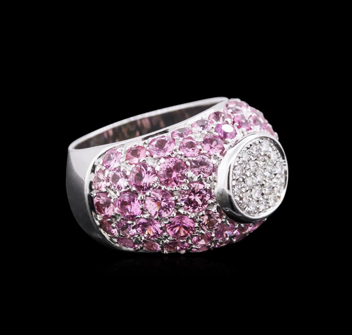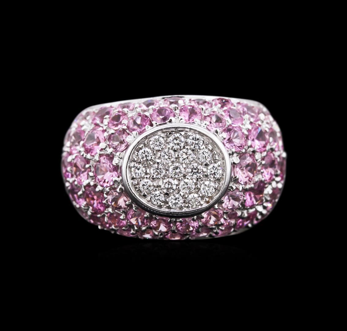 One electronically tested 18KT white gold ladies cast sapphire and diamond ring with a bright polish finish. Identified with markings of "750". Condition is new. Containing: Sixty-four prong set round modified brilliant cut natural pink sapphires, measuring 3.20 - 3.20 x 2.08 mm, approximate. Total Weight of 10.88ct., clarity is slightly included, medium light, very slightly grayish, pink color, (GIA Pk 4/3), cut is good. Nineteen prong set round brilliant cut diamonds, measuring 1.50 - 1.50 x 0.90mm (depth est.) approximate. Total Weight of 19 Stones = 0.25ct. Clarity: VS-2 to SI-1. Color: H - I, Cut is Good. Colored gemstones are presumed to have been subjected to commonly used enhancement processes. All diamonds and colored gemstones are graded in the mounting, unless otherwise stated. Total Weight of Colored Stones 10.88ct. Total Weight of Diamonds 0.25ct. Total Weight of Ring 16.30 grams. GGL Appraised at $6,689.00.