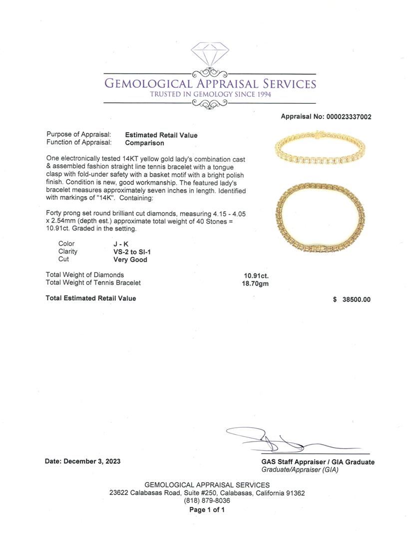 One new 10.91 ctw Diamond Tennis Bracelet - 14KT Yellow Gold. Appraisal Value: $38500. See appraisal for full details.
