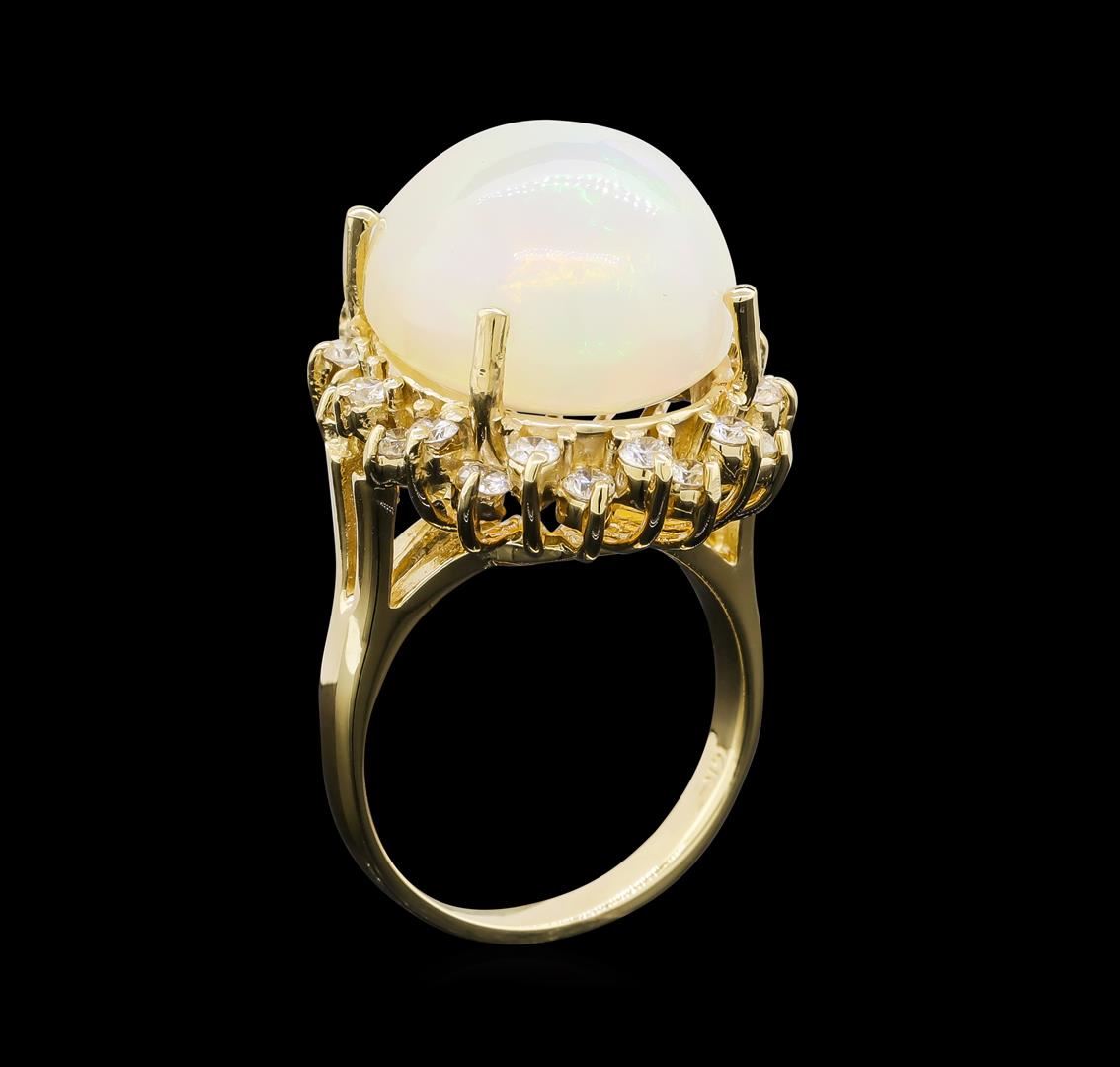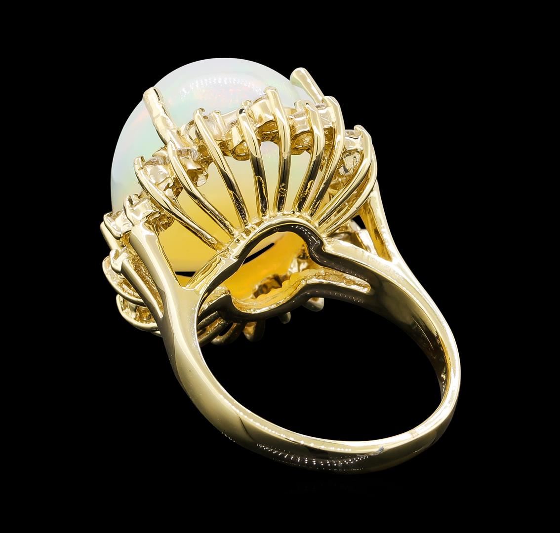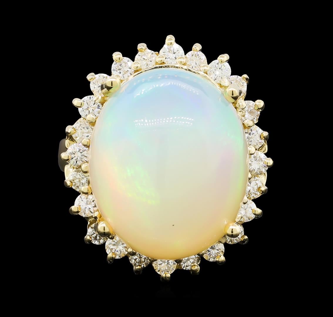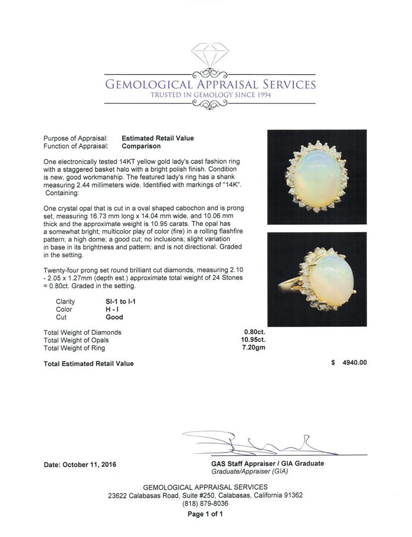 One electronically tested 14KT yellow gold lady's cast fashion ring with a staggered basket halo with a bright polish finish. The featured lady's ring has a shank measuring 2.44 millimeters wide. Identified with markings of '14K'. Condition is new, good workmanship. Containing: One crystal opal that is cut in a oval shaped cabochon and is prong set, measuring 16.73 mm long x 14.04 mm wide, and 10.06 mm thick and the approximate weight is 10.95 carats. The opal has a somewhat bright, multicolor play of color (fire) in a rolling flashfire pattern; a high dome; a good cut; no inclusions; slight variation in base in its brightness and pattern; and is not directional. Graded in the setting. Twenty-Four prong set round brilliant cut diamonds, measuring 2.10 - 2.05 x 1.27mm (depth est.) approximate total weight of 24 Stones = 0.80ct. Graded in the setting. Clarity SI-1 to I-1. Color: H - I Cut Good. Total Weight of Diamonds 0.80ct.. Total Weight of Opals 10.95ct.. Total Weight of Ring 7.20gm. GAS Appraised at $4,940.00.