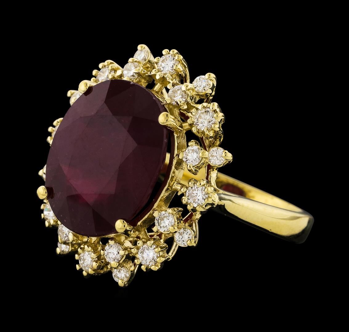 One Ruby and Diamond Ring featuring: 14KT Yellow Gold with a total weight of 5.86 grams, Ruby with a total weight of 10.95ct, and 24 diamonds with a total weight of 0.60ctw.