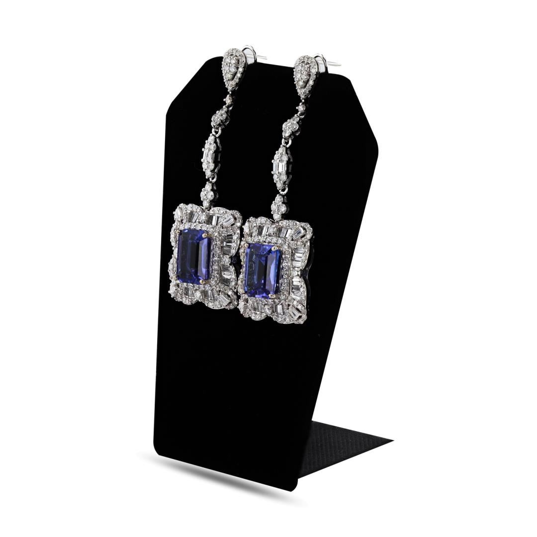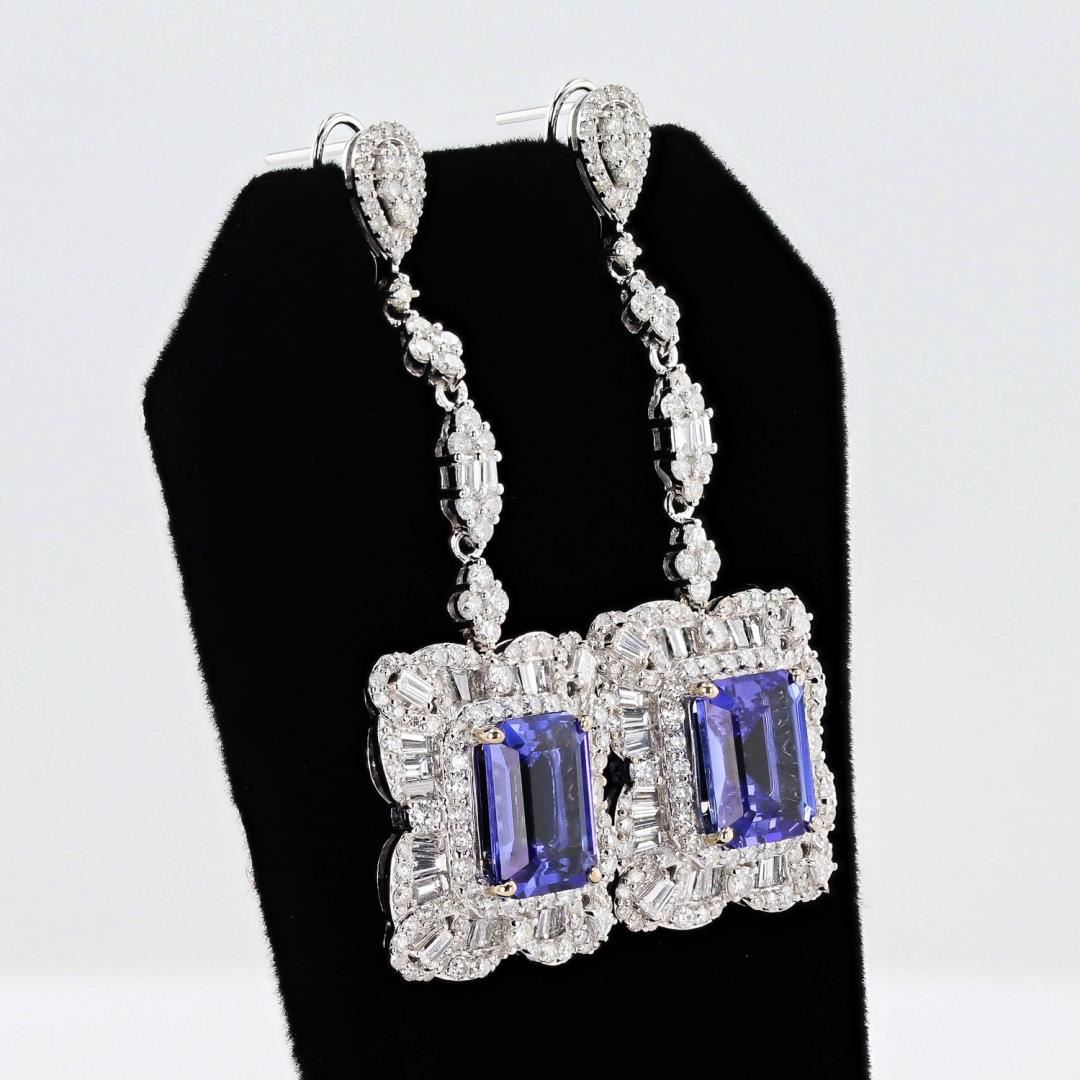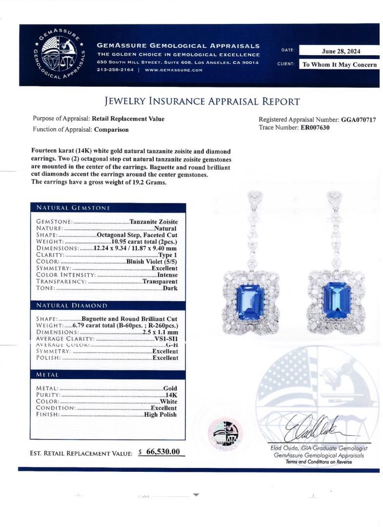 Fourteen karat (14K) white gold natural tanzanite zoisite and diamond earrings. Two (2) octagonal step cut natural tanzanite zoisite gemstones are mounted in the center of the earrings. Baguette and round brilliant cut diamonds accent the earrings around the center gemstones. The earrings have a gross weight of 19.2 Grams. #NATURAL GEMSTONE# GEMSTONE: Tanzanite Zoisite NATURE: Natural SHAPE: Octagonal Step, Faceted Cut WEIGHT: 10.95 carat total (2pcs.) DIMENSIONS: 12.24 x 9.34 / 11.87 x 9.40mm CLARITY: Type 1 COLOR: Bluish Violet (5/5) SYMMETRY: Excellent COLOR INTENSITY: Intense TRANSPARENCY: Transparent TONE: Dark #NATURAL DIAMOND# SHAPE: Baguette and Round Brilliant Cut WEIGHT: 6.79 carat total (B-60pcs., R-260pcs.) DIMENSION: 2.5 x 1.1mm AVERAGE CLARITY: VS1-SI1 AVERAGE COLOR: G-H SYMMETRY: Excellent POLISH: Excellent #METAL# METAL: Gold PURITY: 14K COLOR: White CONDITION: Excellent FINISH: High Polish #LREF-18856