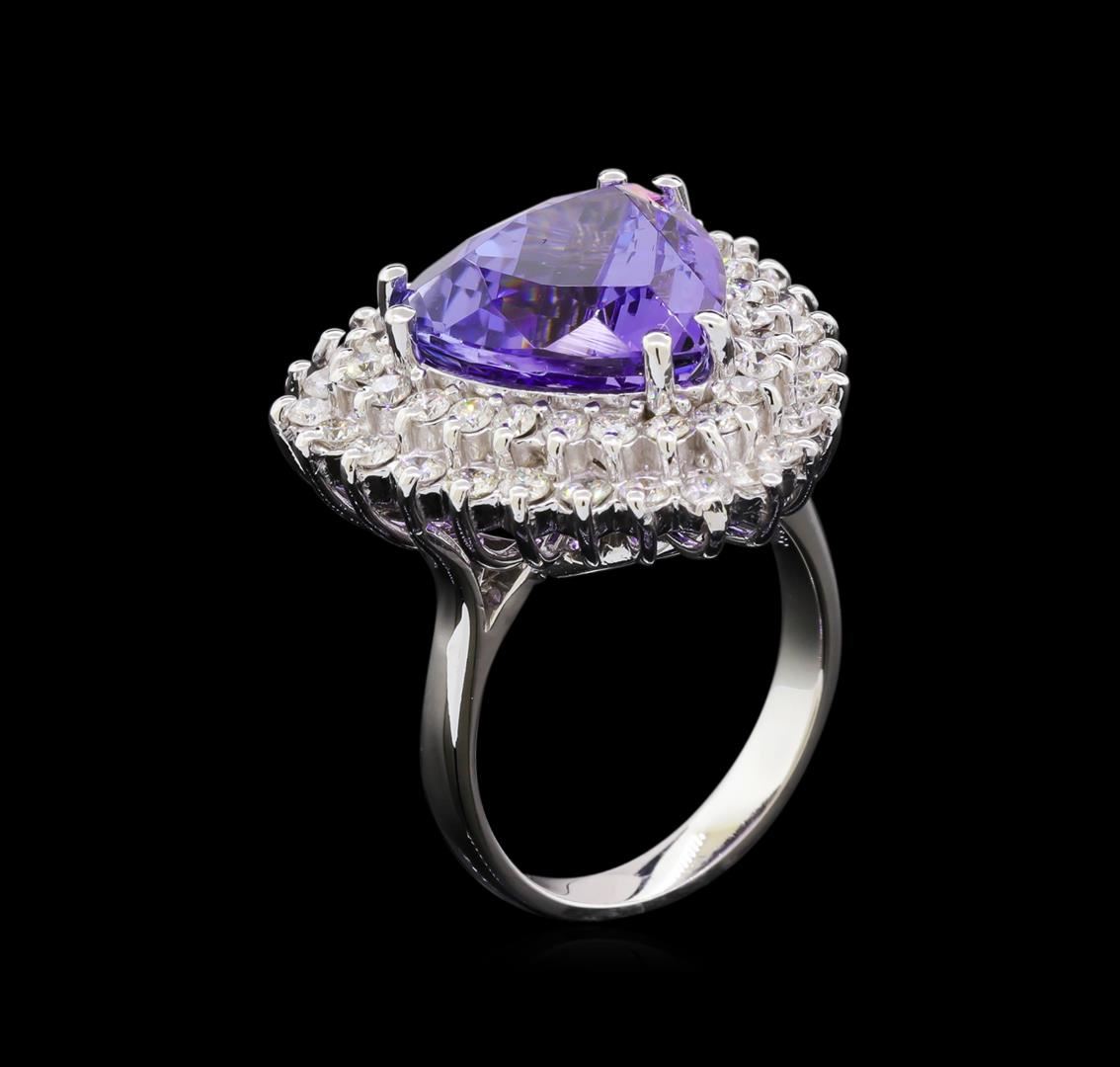One electronically tested 14KT white gold lady's cast fashion ring with a double basket halo with a bright polish finish. The featured lady's ring has a shank measuring 3.00 millimeters wide. Identified with markings of "K14". Condition is new, good workmanship. Containing: One prong set triangle modified brilliant cut natural tanzanite, measuring 13.15 x 13.08 x 9.17mm, 15%. bulge factor, approximate weight of 10.95ct., clarity is eye clean, type I, medium, very slightly grayish, bluish violet color, (GIA bV 5/3), cut is very good. Transmitting light with no distortion, transparent. Colored gemstones are presumed to have been subjected to commonly used enhancement processes. Graded in the setting. Twenty-Seven prong set round brilliant cut diamonds, measuring 2.10 - 2.05 x 1.27mm (depth est.) approximate total weight of 27 Stones = 0.90ct. Graded in the setting. Clarity: VS-2 to SI-2. Color: G - Very Good Twenty-Four prong set round brilliant cut diamonds, measuring 1.95 - 1.85 x 1.18mm (depth est.) approximate total weight of 24 Stones = 0.62ct. Graded in the setting. Clarity: VS-2 to SI-2. Color: G - Very Good. Total Weight of Colored Stones 10.95ct. Total Weight of Diamonds 1.52ct. Total Weight of Ring 11.50gm. GAS Appraised at $23,340.00.
