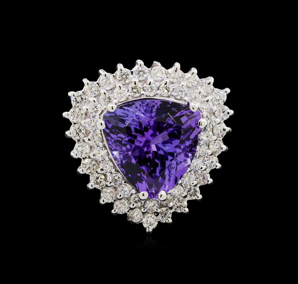 One electronically tested 14KT white gold lady's cast fashion ring with a double basket halo with a bright polish finish. The featured lady's ring has a shank measuring 3.00 millimeters wide. Identified with markings of "K14". Condition is new, good workmanship. Containing: One prong set triangle modified brilliant cut natural tanzanite, measuring 13.15 x 13.08 x 9.17mm, 15%. bulge factor, approximate weight of 10.95ct., clarity is eye clean, type I, medium, very slightly grayish, bluish violet color, (GIA bV 5/3), cut is very good. Transmitting light with no distortion, transparent. Colored gemstones are presumed to have been subjected to commonly used enhancement processes. Graded in the setting. Twenty-Seven prong set round brilliant cut diamonds, measuring 2.10 - 2.05 x 1.27mm (depth est.) approximate total weight of 27 Stones = 0.90ct. Graded in the setting. Clarity: VS-2 to SI-2. Color: G - Very Good Twenty-Four prong set round brilliant cut diamonds, measuring 1.95 - 1.85 x 1.18mm (depth est.) approximate total weight of 24 Stones = 0.62ct. Graded in the setting. Clarity: VS-2 to SI-2. Color: G - Very Good. Total Weight of Colored Stones 10.95ct. Total Weight of Diamonds 1.52ct. Total Weight of Ring 11.50gm. GAS Appraised at $23,340.00.
