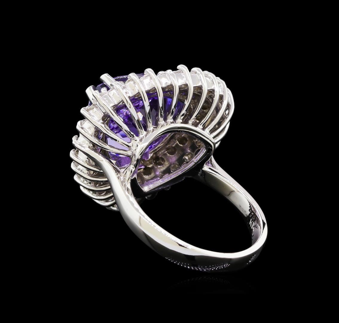 One electronically tested 14KT white gold lady's cast fashion ring with a double basket halo with a bright polish finish. The featured lady's ring has a shank measuring 3.00 millimeters wide. Identified with markings of "K14". Condition is new, good workmanship. Containing: One prong set triangle modified brilliant cut natural tanzanite, measuring 13.15 x 13.08 x 9.17mm, 15%. bulge factor, approximate weight of 10.95ct., clarity is eye clean, type I, medium, very slightly grayish, bluish violet color, (GIA bV 5/3), cut is very good. Transmitting light with no distortion, transparent. Colored gemstones are presumed to have been subjected to commonly used enhancement processes. Graded in the setting. Twenty-Seven prong set round brilliant cut diamonds, measuring 2.10 - 2.05 x 1.27mm (depth est.) approximate total weight of 27 Stones = 0.90 ct. Graded in the setting. Clarity: VS-2 to SI-2. Color: G - Very Good Twenty-Four prong set round brilliant cut diamonds, measuring 1.95 - 1.85 x 1.18mm (depth est.) approximate total weight of 24 Stones = 0.62ct. Graded in the setting. Clarity: VS-2 to SI-2. Color: G - Very Good. Total Weight of Colored Stones 10.95ct. Total Weight of Diamonds 1.52ct. Total Weight of Ring 11.50gm. GAS Appraised.