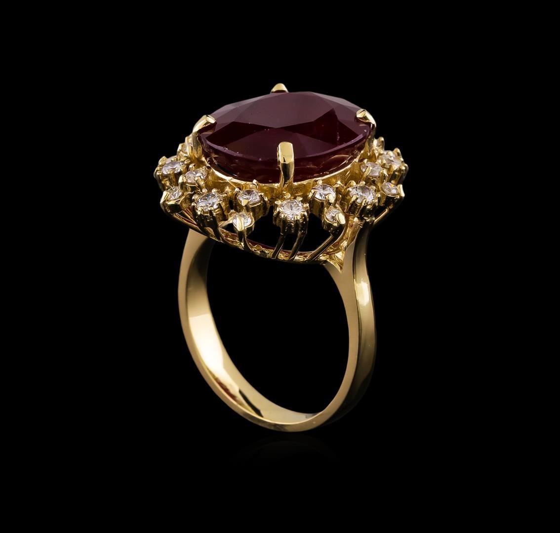 One electronically tested 14KT yellow gold lady's cast fashion ring with a basket double halo with a bright polish finish. The featured lady's ring has a shank measuring 2.99 millimeters wide. Identified with markings of "K14". Condition is new, good workmanship. Containing: One prong set oval modified brilliant cut natural ruby, measuring 14.70 x 12.54 x 6.22mm, (depth est.) 5%. bulge factor, approximate weight of 10.98ct., clarity is severely included, dark, moderately strong, slightly purplish red color, (GIA slpR 7/4), cut is very good. Colored gemstones are presumed to have been subjected to commonly used enhancement processes. Indications of laboratory high temperature heat treatment, with glass & flux additives. Graded in the setting. Eight prong set round brilliant cut diamonds, measuring 2.30 - 2.20 x 1.40mm (depth est.) approximate total weight of 8 Stones = 0.35ct. Graded in the setting. Clarity: VS-2 to SI-2. Color: H - I. Cut Good Eight prong set round brilliant cut diamonds, measuring 2.00 - 1.90 x 1.17mm (depth est.) approximate total weight of 8 Stones = 0.22ct. Graded in the setting. Clarity: SI-1 to SI-2. Color: H - I. Cut Good Eight prong set round brilliant cut diamonds, measuring 1.60 - 1.55 x 0.98mm (depth est.) approximate total weight of 8 Stones = 0.12ct. Graded in the setting. Clarity: SI-1 to SI-2. Color: H - I. Cut Good. Total Weight of Colored Stones 10.98ct. Total Weight of Diamonds 0.69ct. Total Weight of Ring 8.30gm. GAS Appraised.