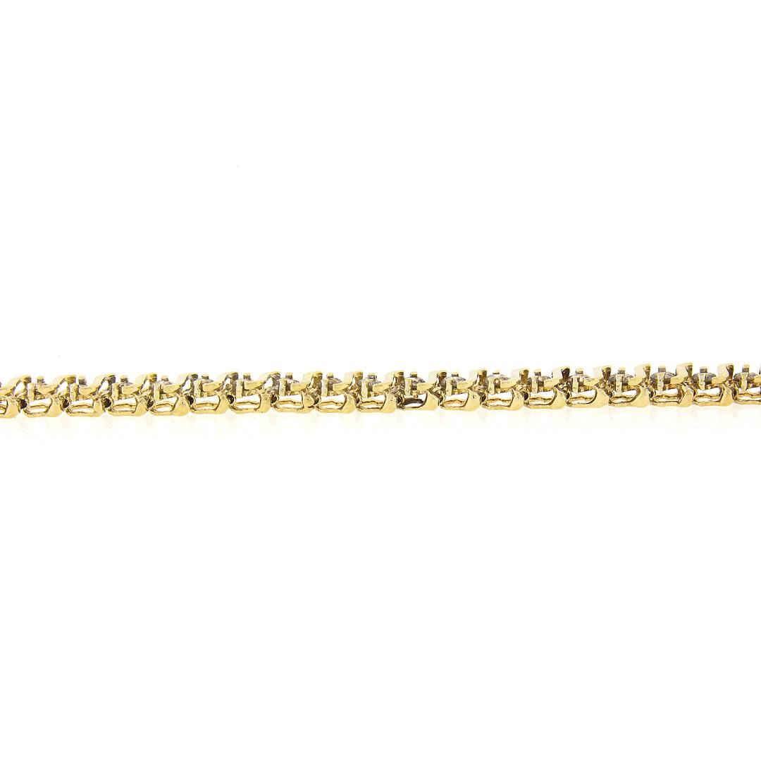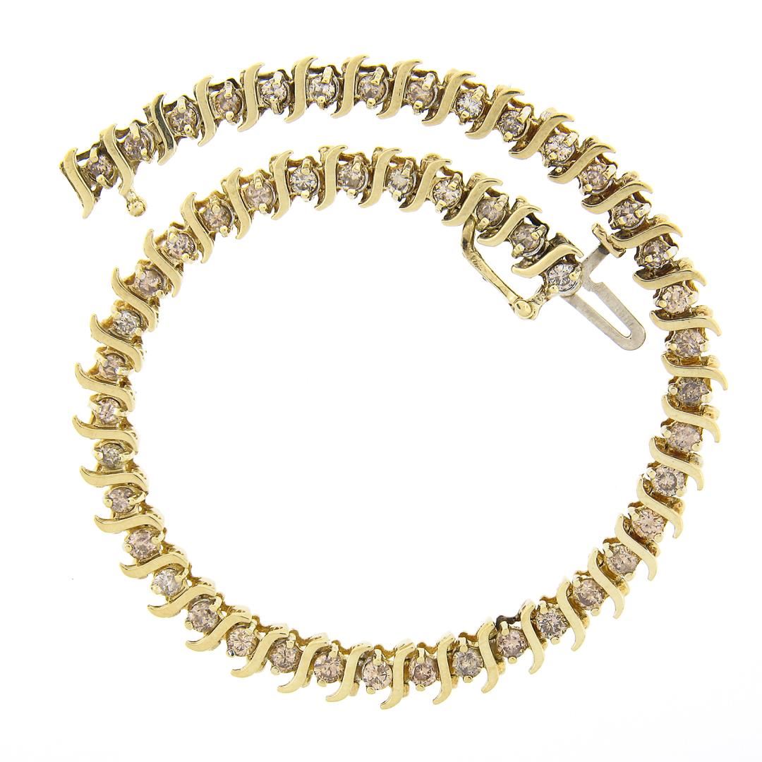 A solid 10k yellow gold line tennis bracelet, with 49 round brilliant cut natural champagne diamonds (I1/I2 ; 2ctw). It weighs a total of 8.28 grams, measures 5.1mm wide, and measures 6.75 inches in length.