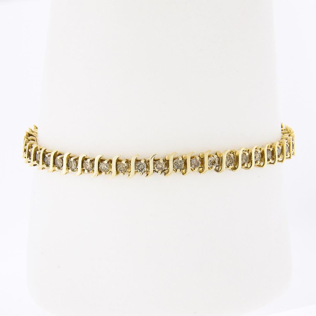 A solid 10k yellow gold line tennis bracelet, with 49 round brilliant cut natural champagne diamonds (I1/I2 ; 2ctw). It weighs a total of 8.28 grams, measures 5.1mm wide, and measures 6.75 inches in length.