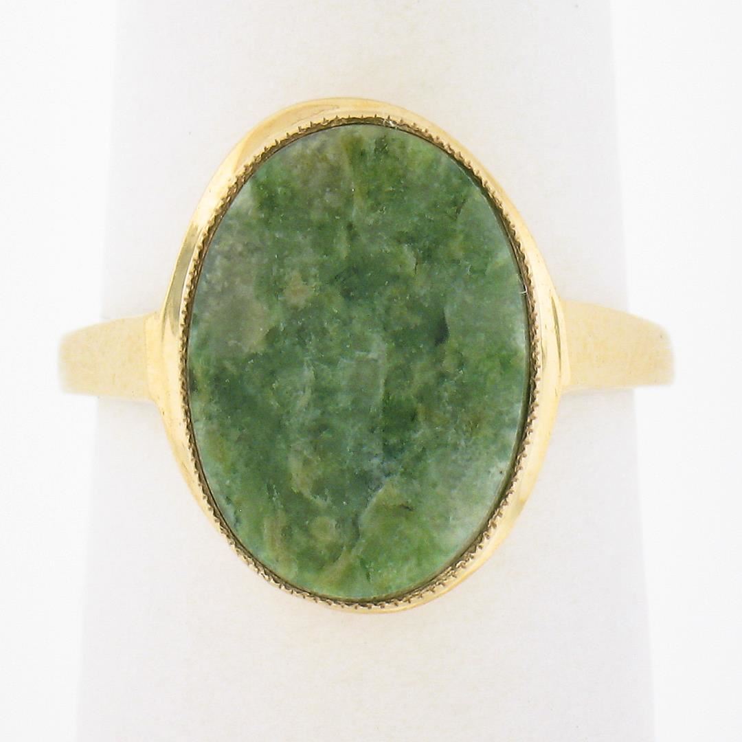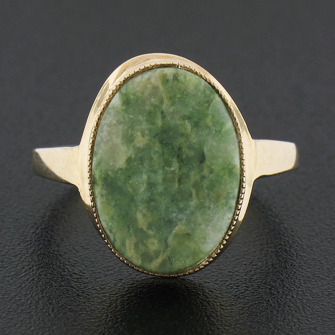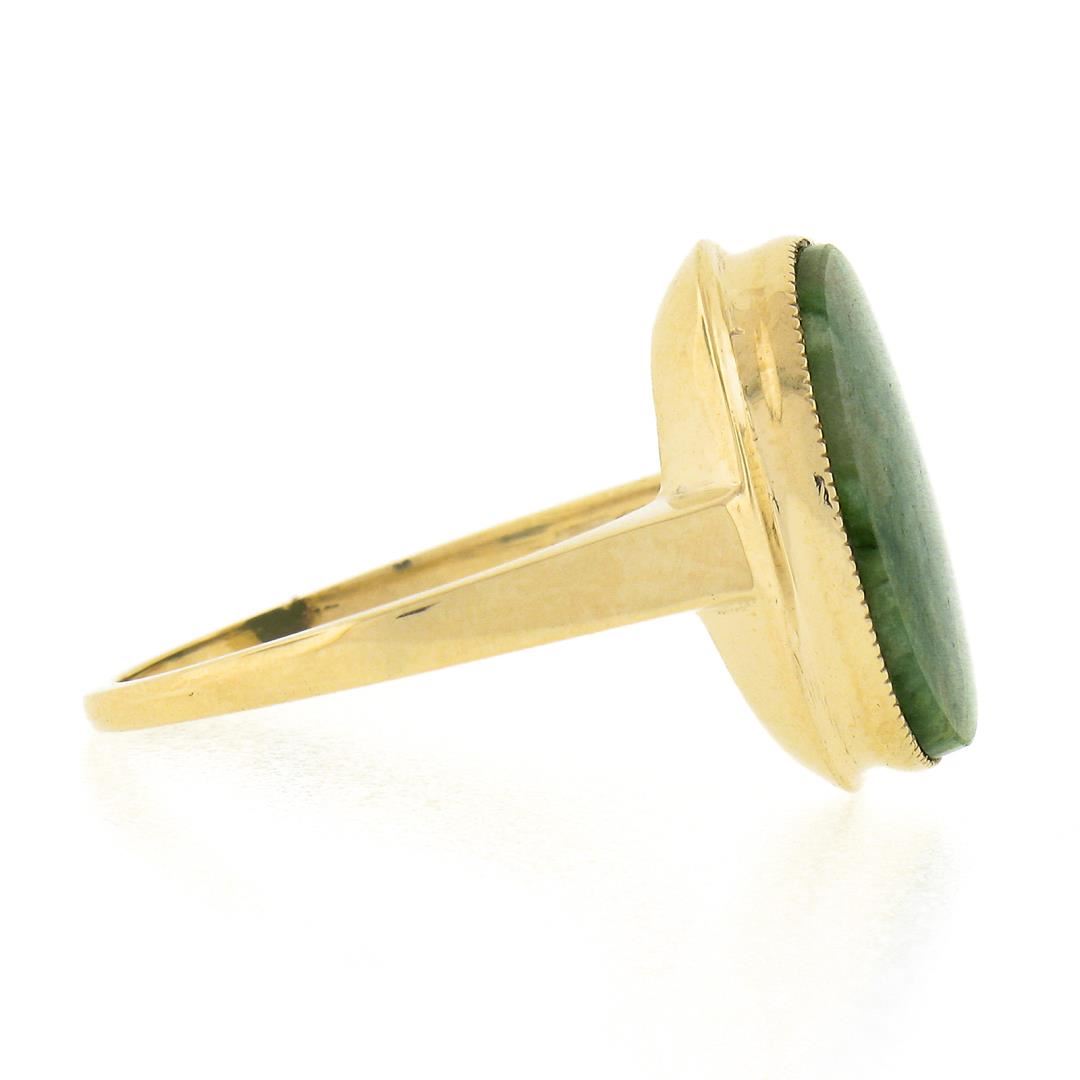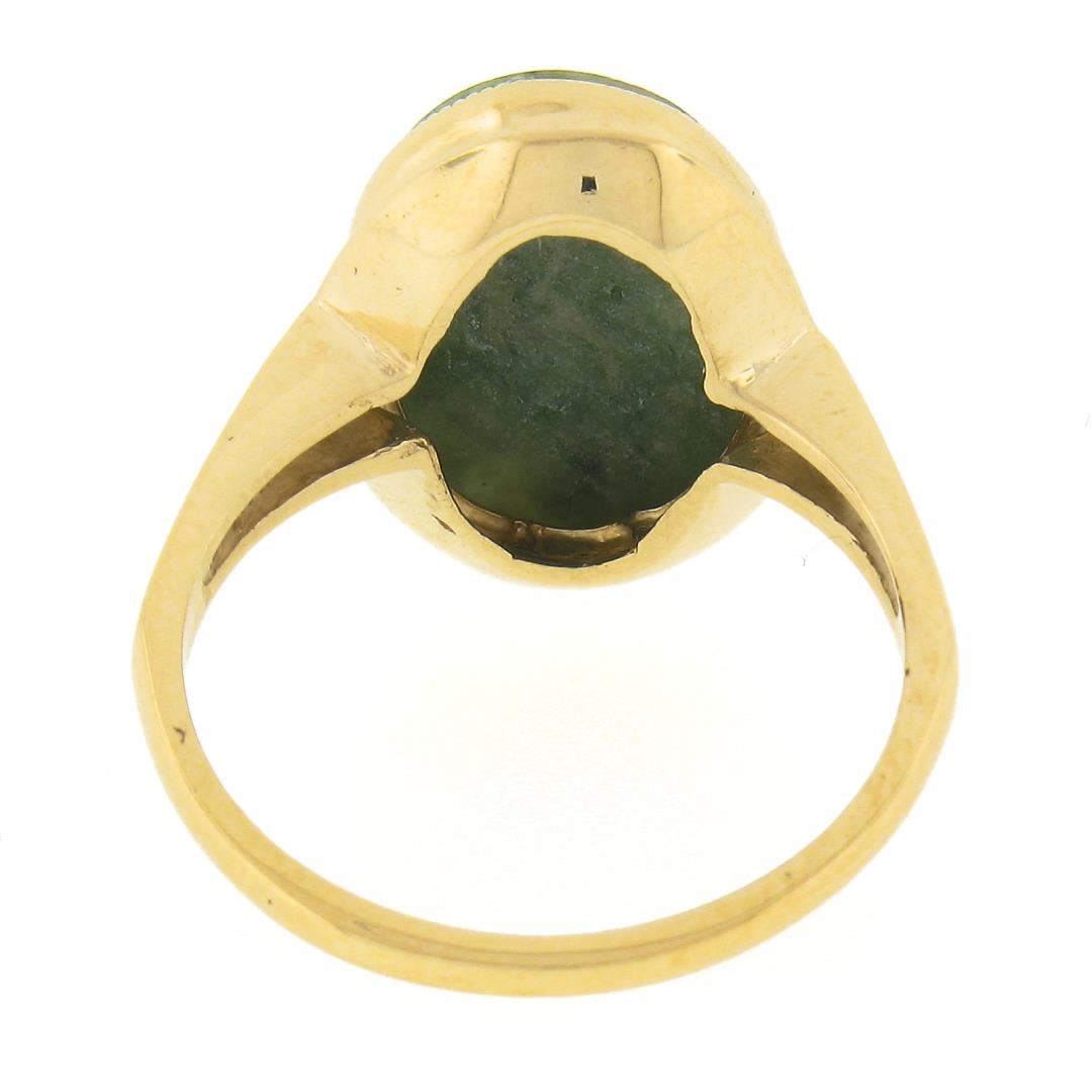 A solid 10k yellow gold solitaire ring, with 1 oval cabochon cut natural jade (14.0x10.1mm). The ring is size 6.0, weighs a total of 2.93 grams, and measures 15.40mm wide.