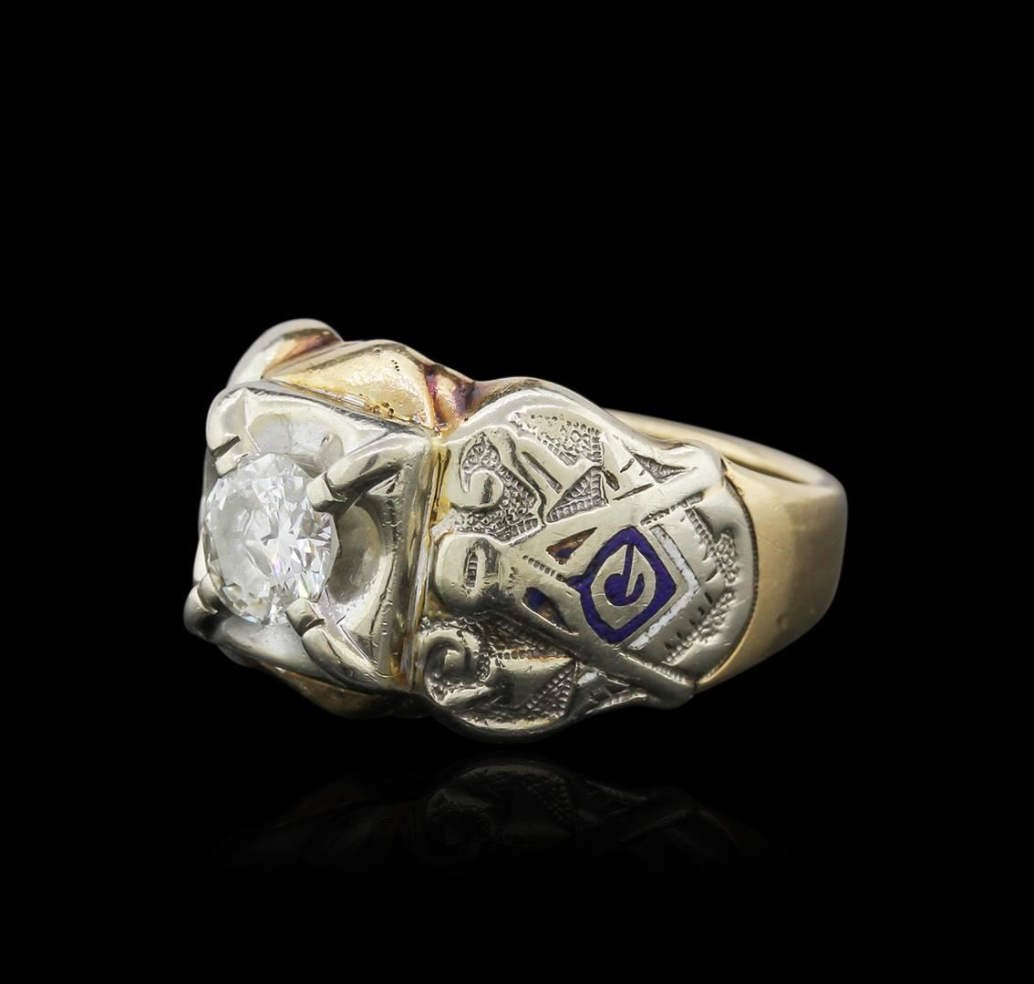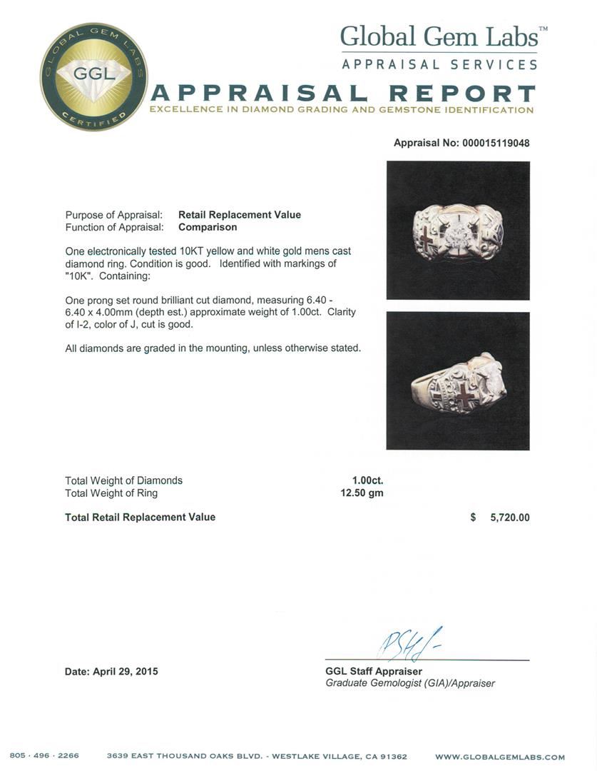 One electronically tested 10KT yellow and white gold mens cast diamond ring. Identified with markings of "10K". Condition is good. Containing: One prong set round brilliant cut diamond, measuring 6.40 - 6.40 x 4.00mm (depth est.) approximate weight of 1.00ct. Clarity: I-2. Color: J, Cut is Good. All diamonds are graded in the mounting, unless otherwise stated. Total Weight of Diamonds 1.00ct. Total Weight of Ring 12.50 grams. GGL Appraised at $5,720.00.