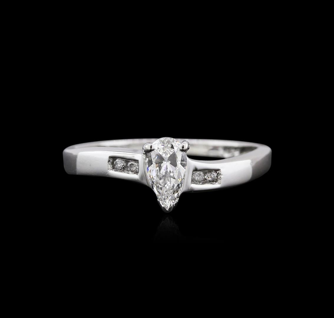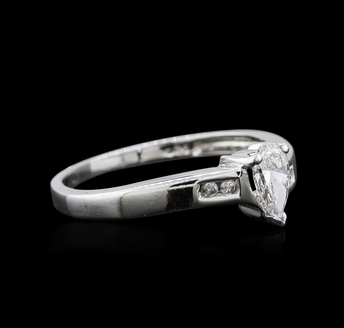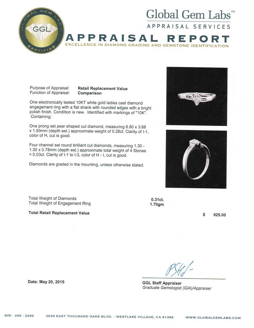 One electronically tested 10KT white gold ladies cast diamond engagement wedding ring with a flat shank with rounded edges with a bright polish finish. Identified with markings of "10K". Condition is new. Containing: One prong set pear shaped cut diamond, measuring 6.80 x 3.68 x 1.93mm (depth est.) approximate weight of 0.28ct. Clarity: I-1. Color: H, Cut is Good. Four channel set round brilliant cut diamonds, measuring 1.30 - 1.30 x 0.78mm (depth est.) approximate total weight of 4 Stones = 0.03ct. Clarity: I-1 to I-3. Color: H - I, Cut is Good. Diamonds are graded in the mounting, unless otherwise stated. Total Weight of Diamonds 0.31ct. Total Weight of Solitaire Wedding Ring 1.70 grams. GGL Appraised at $925.00.