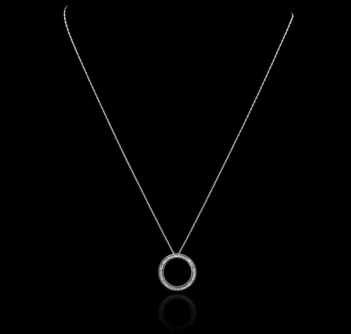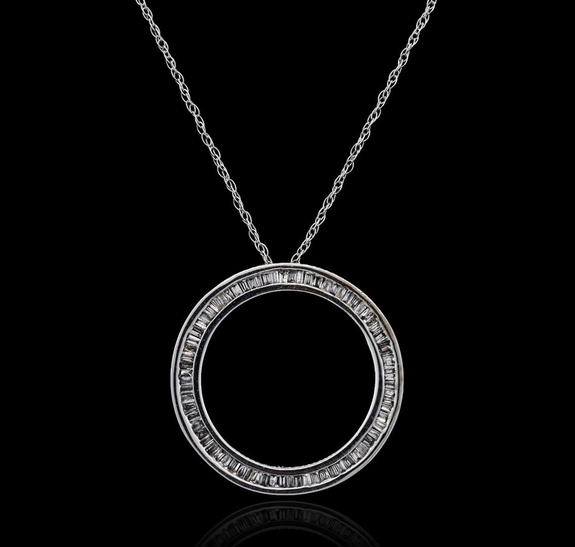One circle pendant with chain featuring: 10KT white gold weighing 1.86 grams containing baguette cut diamonds with a total weight of 0.35cts.