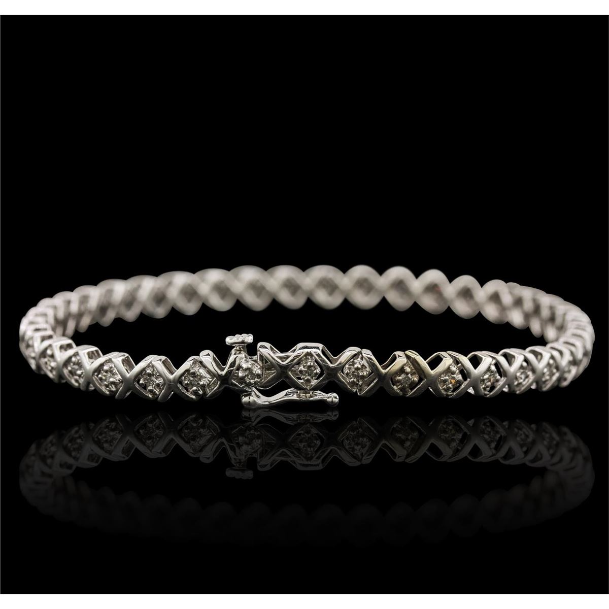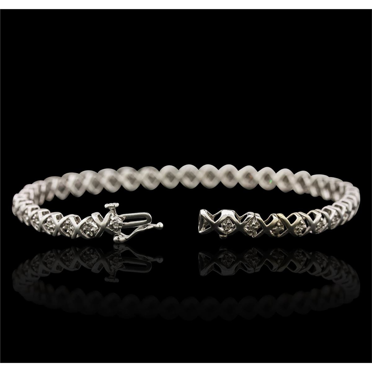 One electronically tested 10KT white gold ladies cast & assembled diamond bracelet. Seven and one-quarter inch length bracelet features a flexible diamond ribbon of X's and O's, terminating in a concealed clasp with safety. Bright polish finish. Identified with markings of "10K". Condition is new, good workmanship. Containing: Forty prong set single cut diamonds, measuring 1.30 - 1.20 x 0.75mm (depth est.) approximate. Total Weight of 40 Stones = 0.40ct. Graded in the setting. Clarity: I-1 to I-2. Color: H - J. Total Weight of Diamonds 0.40ct. Total Weight of Bracelet 7.18gm. AIG Appraised at $1,690.00.