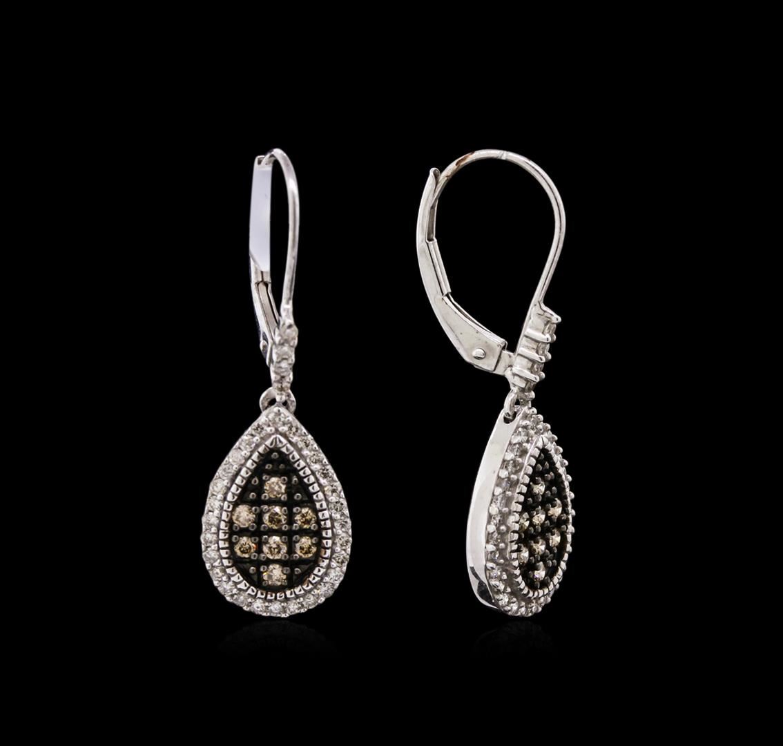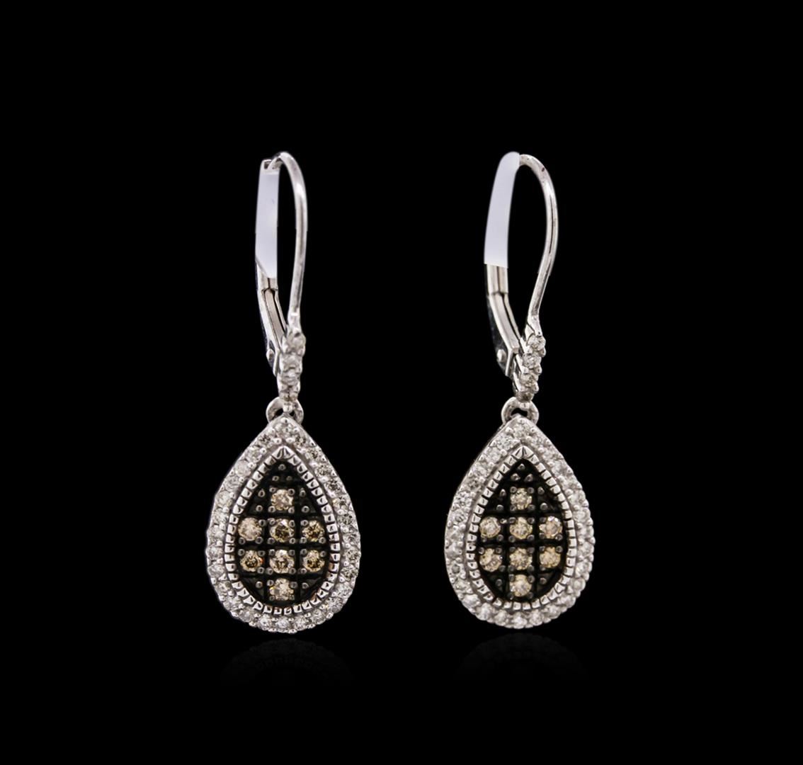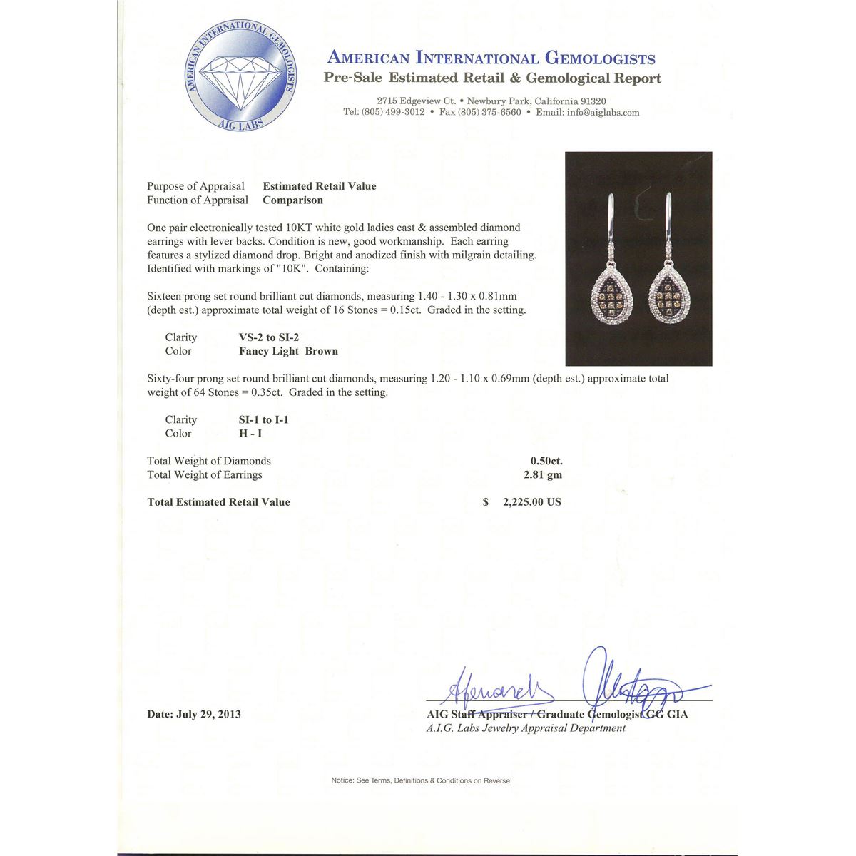 One pair electronically tested 10KT white gold ladies cast & assembled diamond earrings with lever backs. Condition is new, good workmanship. Each earring features a stylized diamond drop. Bright and anodized finish with milgrain detailing. Identified with markings of "10K". Containing: Sixteen prong set round brilliant cut diamonds, measuring 1.40 - 1.30 x 0.81mm (depth est.) approximate total weight of 16 Stones = 0.15ct. Graded in the setting. Clarity VS-2 to SI-2. Color Fancy Light Brown Sixty-four prong set round brilliant cut diamonds, measuring 1.20 - 1.10 x 0.69mm (depth est.) approximate total weight of 64 Stones = 0.35ct. Graded in the setting. Clarity SI-1 to I-1. Color H -- I. Total Weight of Diamonds 0.50ct. Total Weight of Earrings 2.81gm. AIG Appraised at $2,225.00.