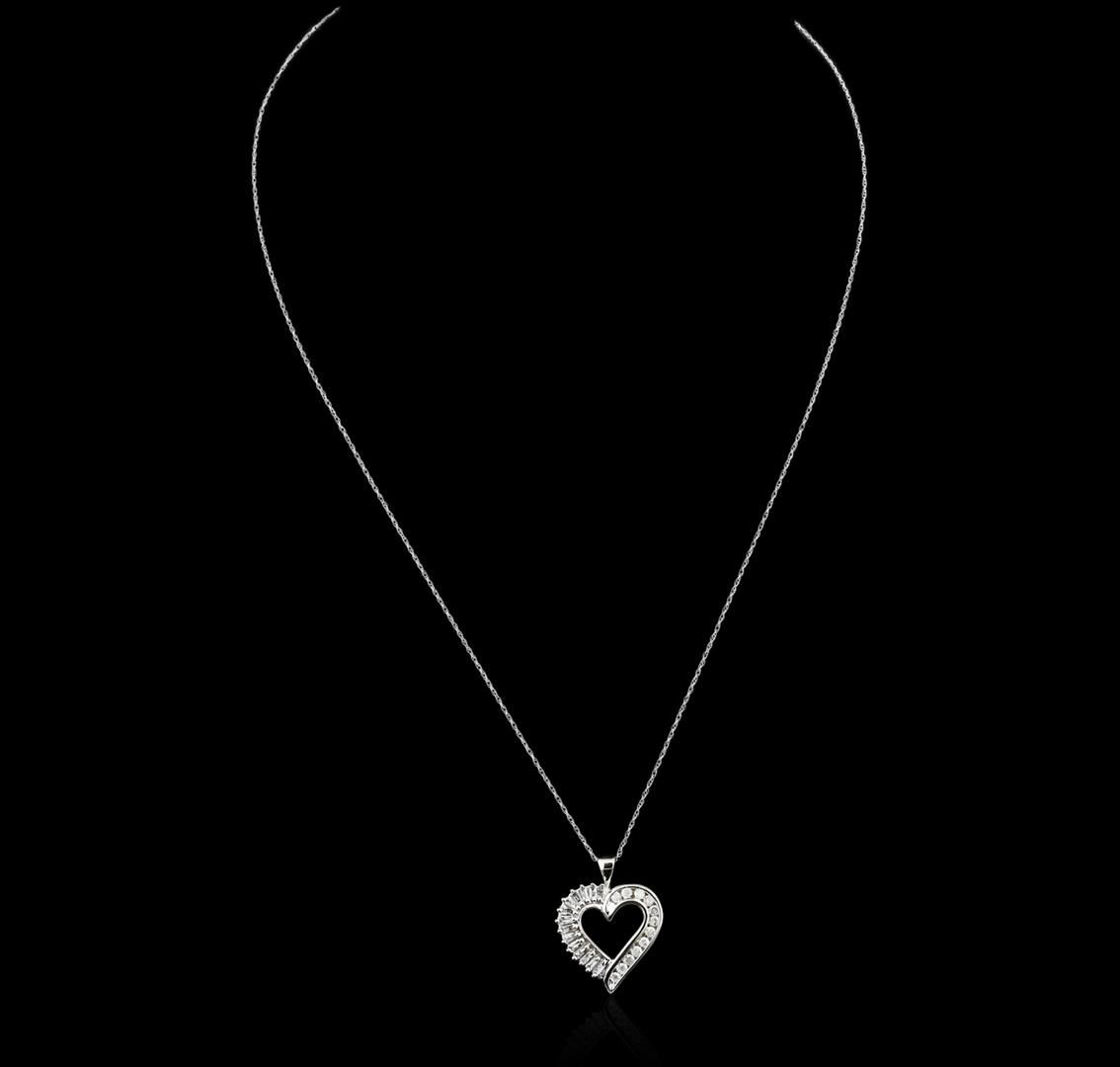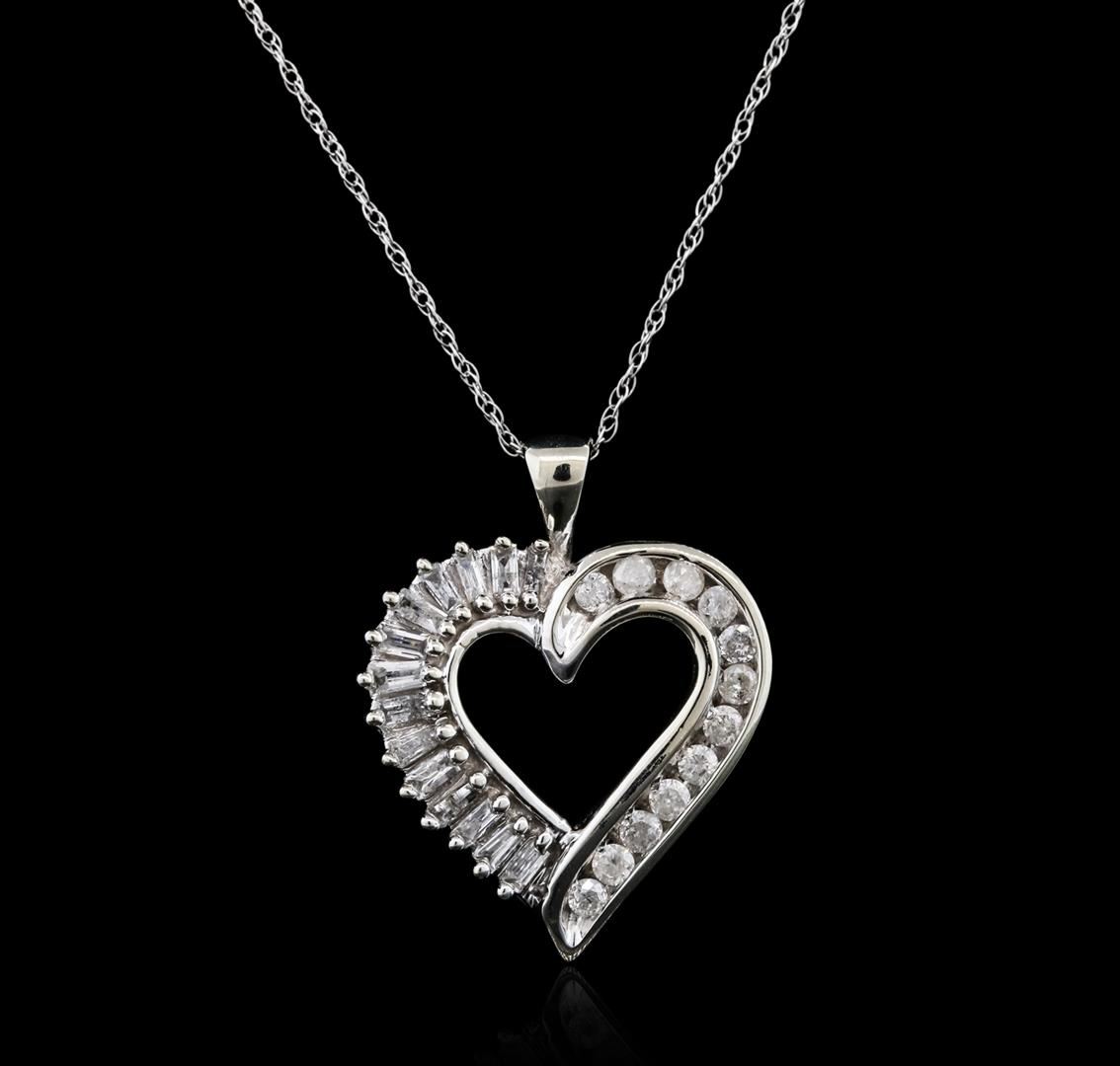 One heart pendant with chain featuring: 10KT white gold weighing 2.54 grams containing prong set baguette cut/channel set round cut diamonds with a total weight of 0.50cts.