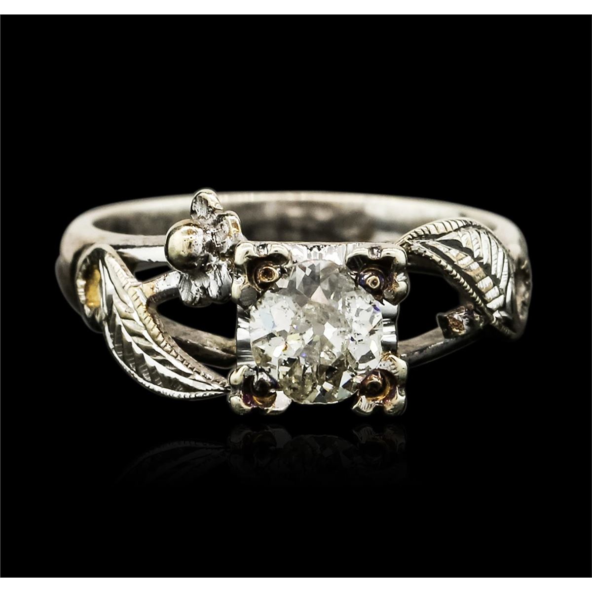 One electronically tested 10KT white gold ladies cast diamond solitaire ring with a bright polish finish. The featured diamond is set within a stylized basket supported by floral designed shoulders, completed by a two and one-half millimeter wide band. Condition is good. Containing: One prong set Old European cut diamond, measuring 5.50 - 5.10 x 2.75mm (depth est.) approximate weight of 0.57ct with a faint blue fluorescence. Cutting style circa early 19th century. Graded in the setting. Clarity: I-1. Color: K. Depth 51.9%. Table 47.2%. Total Weight of Diamonds 0.57ct. Total Weight of Ring 3.51 grams. AIG Appraised at $1,825.00.