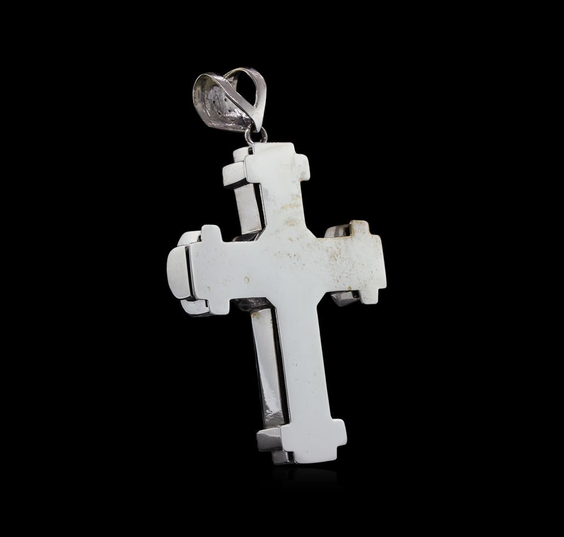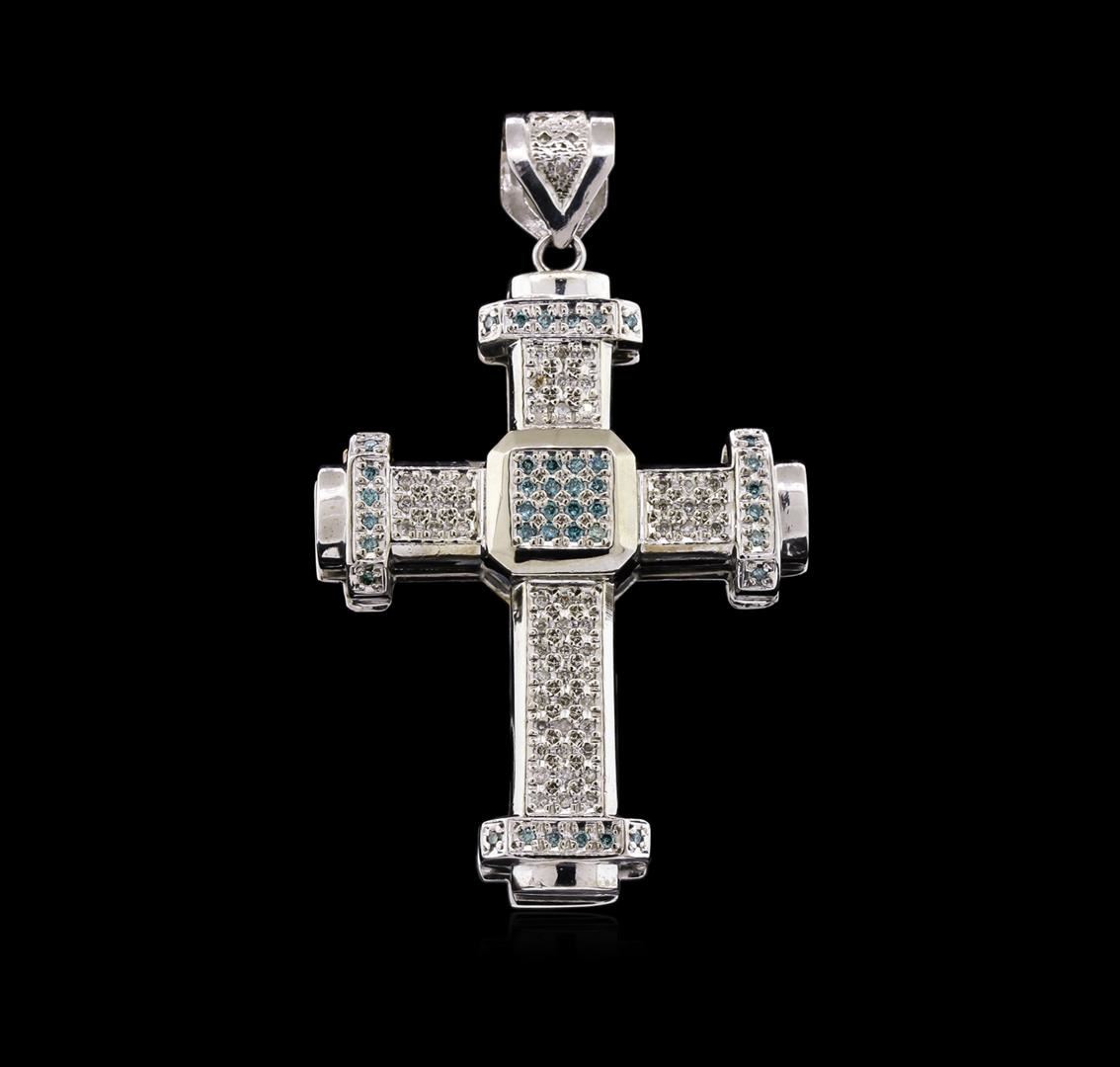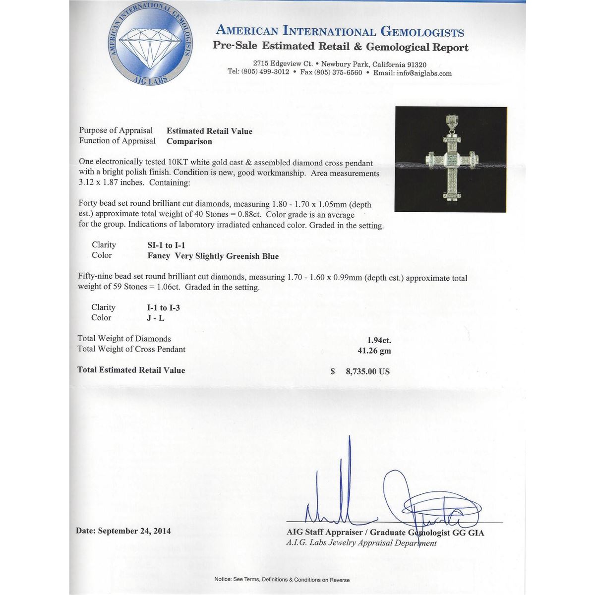 One electronically tested 10KT white gold cast & assembled diamond cross pendant with a bright polish finish. Condition is new, good workmanship. Area measurements 3.12 x 1.87 inches. Containing: Forty bead set round brilliant cut diamonds, measuring 1.80 - 1.70 x 1.05mm (depth est.) approximate total weight of 40 stones = 0.88ct. Color grade is an average for the group. Indications of laboratory irradiated enhanced color. Graded in the setting. Clarity: SI-1 to I-1. Color: Fancy Very Slightly Greenish Blue. Fifty-nine bead set round brilliant cut diamonds, measuring 1.70 - 1.60 x 0.99mm (depth est.) approximate total weight of 59 Stones = 1.06ct. Graded in the setting. Total weight of diamonds 1.94ct. Total weight of Cross Pendant 41.26 grams. AIG Appraised at $8,735.00.