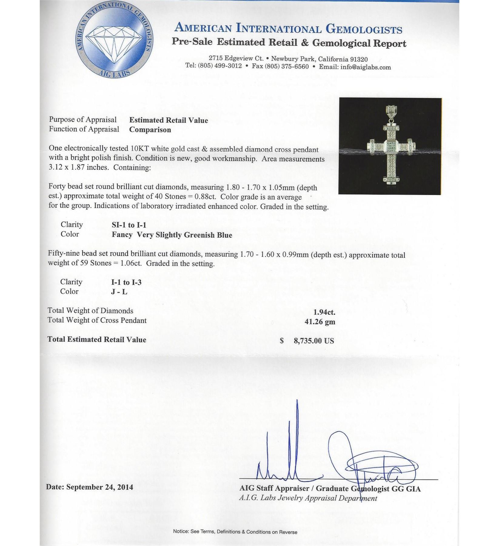One electronically tested 10KT white gold cast & assembled diamond cross pendant with a bright polish finish. Condition is new, good workmanship. Area measurements 3.12 x 1.87 inches. Containing: Forty bead set round brilliant cut diamonds, measuring 1.80 - 1.70 x 1.05mm (depth est.) approximate total weight of 40 stones = 0.88ct. Color grade is an average for the group. Indications of laboratory irradiated enhanced color. Graded in the setting. Clarity: SI-1 to I-1. Color: Fancy Very Slightly Greenish Blue. Fifty-nine bead set round brilliant cut diamonds, measuring 1.70 - 1.60 x 0.99mm (depth est.) approximate total weight of 59 Stones = 1.06ct. Graded in the setting. Total weight of diamonds 1.94ct. Total weight of Cross Pendant 41.26 grams. AIG Appraised at $8,735.00.