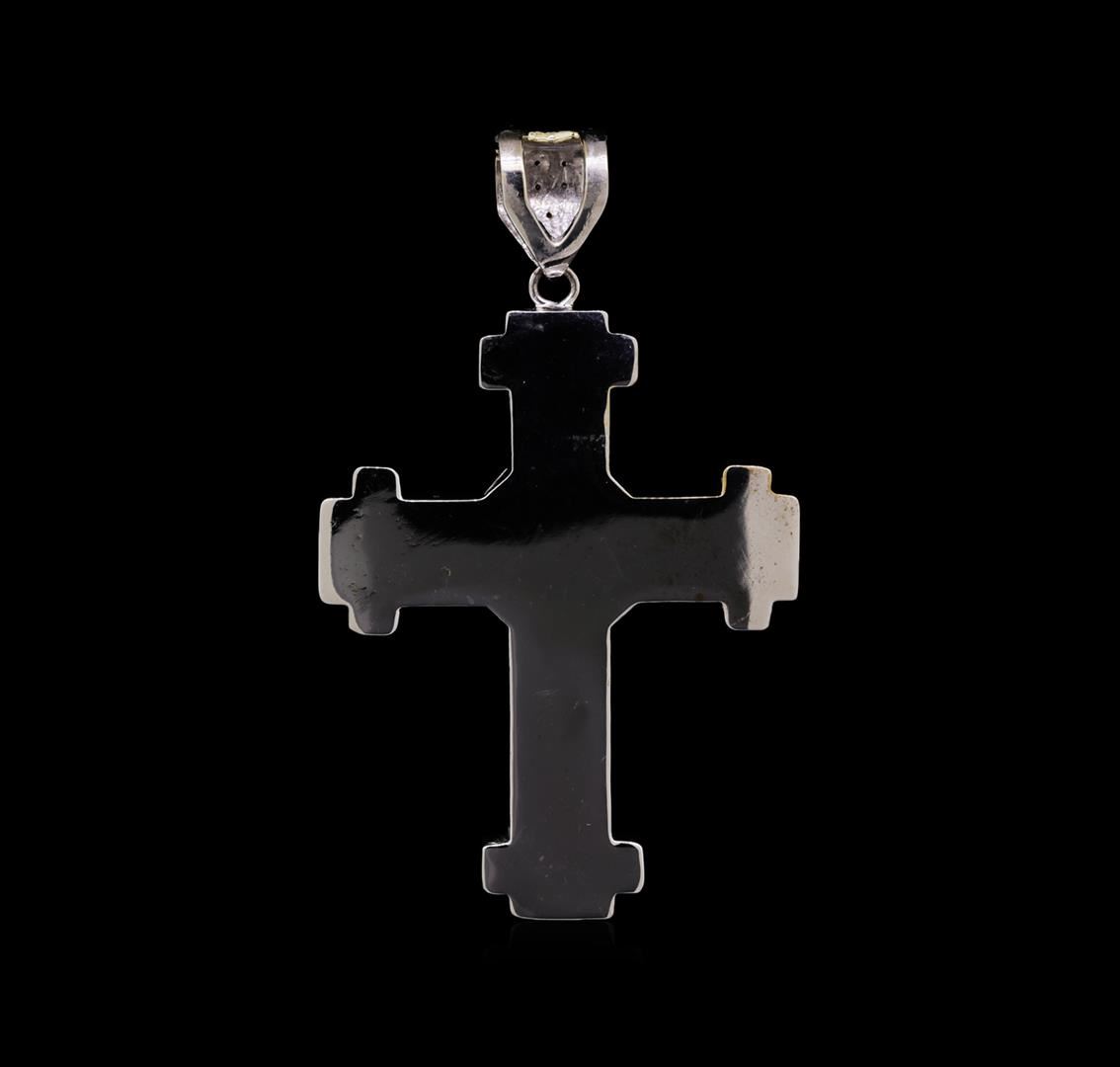 One electronically tested 10KT white gold cast & assembled diamond cross pendant with a bright polish finish. Condition is new, good workmanship. Area measurements 3.12 x 1.87 inches. Containing: Forty bead set round brilliant cut diamonds, measuring 1.80 - 1.70 x 1.05mm (depth est.) approximate total weight of 40 stones = 0.88ct. Color grade is an average for the group. Indications of laboratory irradiated enhanced color. Graded in the setting. Clarity: SI-1 to I-1. Color: Fancy Very Slightly Greenish Blue. Fifty-nine bead set round brilliant cut diamonds, measuring 1.70 - 1.60 x 0.99mm (depth est.) approximate total weight of 59 Stones = 1.06ct. Graded in the setting. Total weight of diamonds 1.94ct. Total weight of Cross Pendant 41.26 grams. AIG Appraised at $8,735.00.
