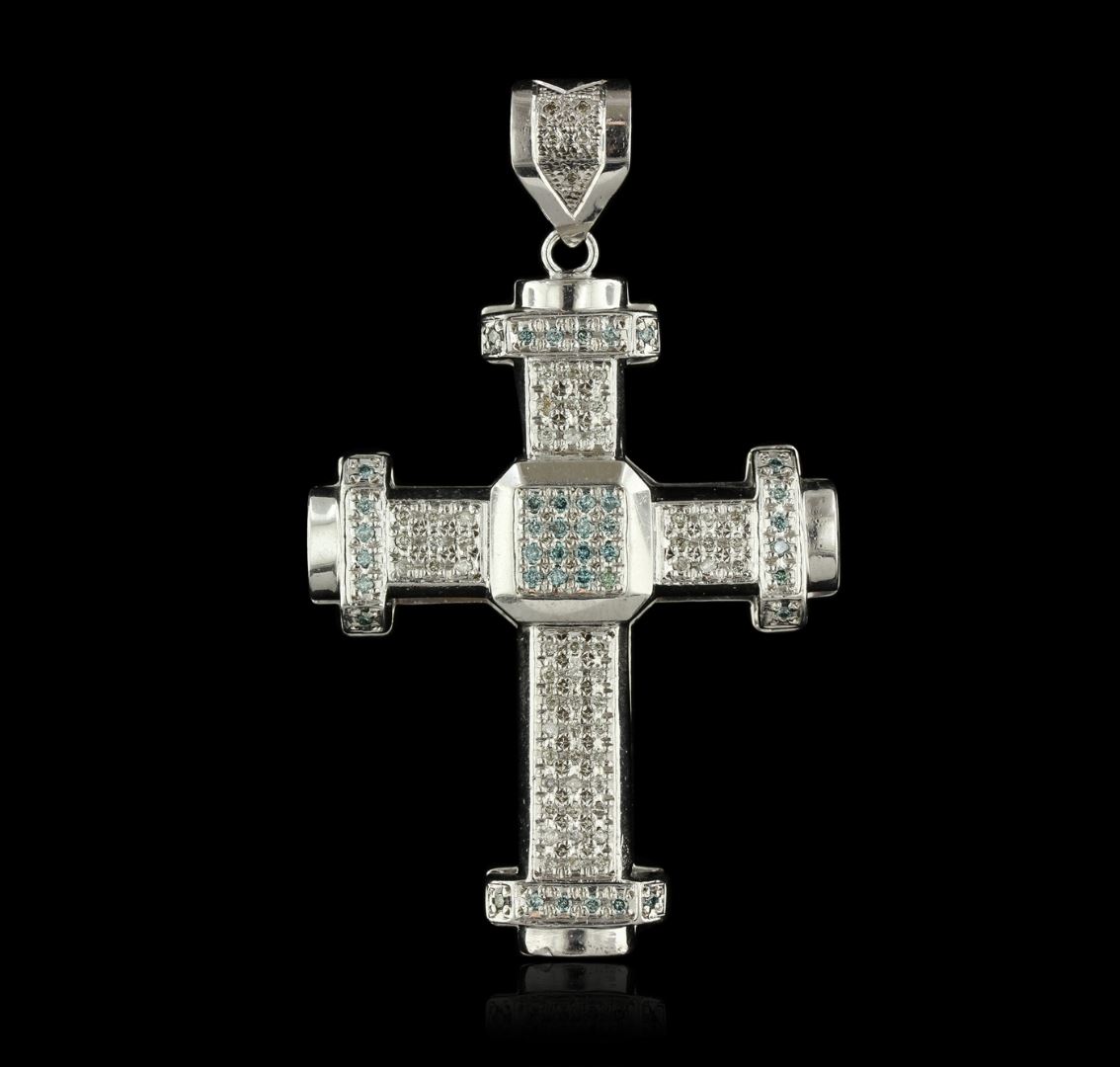 One electronically tested 10KT white gold cast & assembled diamond cross pendant with a bright polish finish. Condition is new, good workmanship. Area measurements 3.12 x 1.87 inches. Containing: Forty bead set round brilliant cut diamonds, measuring 1.80 - 1.70 x 1.05mm (depth est.) approximate total weight of 40 stones = 0.88ct. Color grade is an average for the group. Indications of laboratory irradiated enhanced color. Graded in the setting. Clarity: SI-1 to I-1. Color: Fancy Very Slightly Greenish Blue. Fifty-nine bead set round brilliant cut diamonds, measuring 1.70 - 1.60 x 0.99mm (depth est.) approximate total weight of 59 Stones = 1.06ct. Graded in the setting. Total weight of diamonds 1.94ct. Total weight of Cross Pendant 41.26 grams. AIG Appraised at $8,735.00.