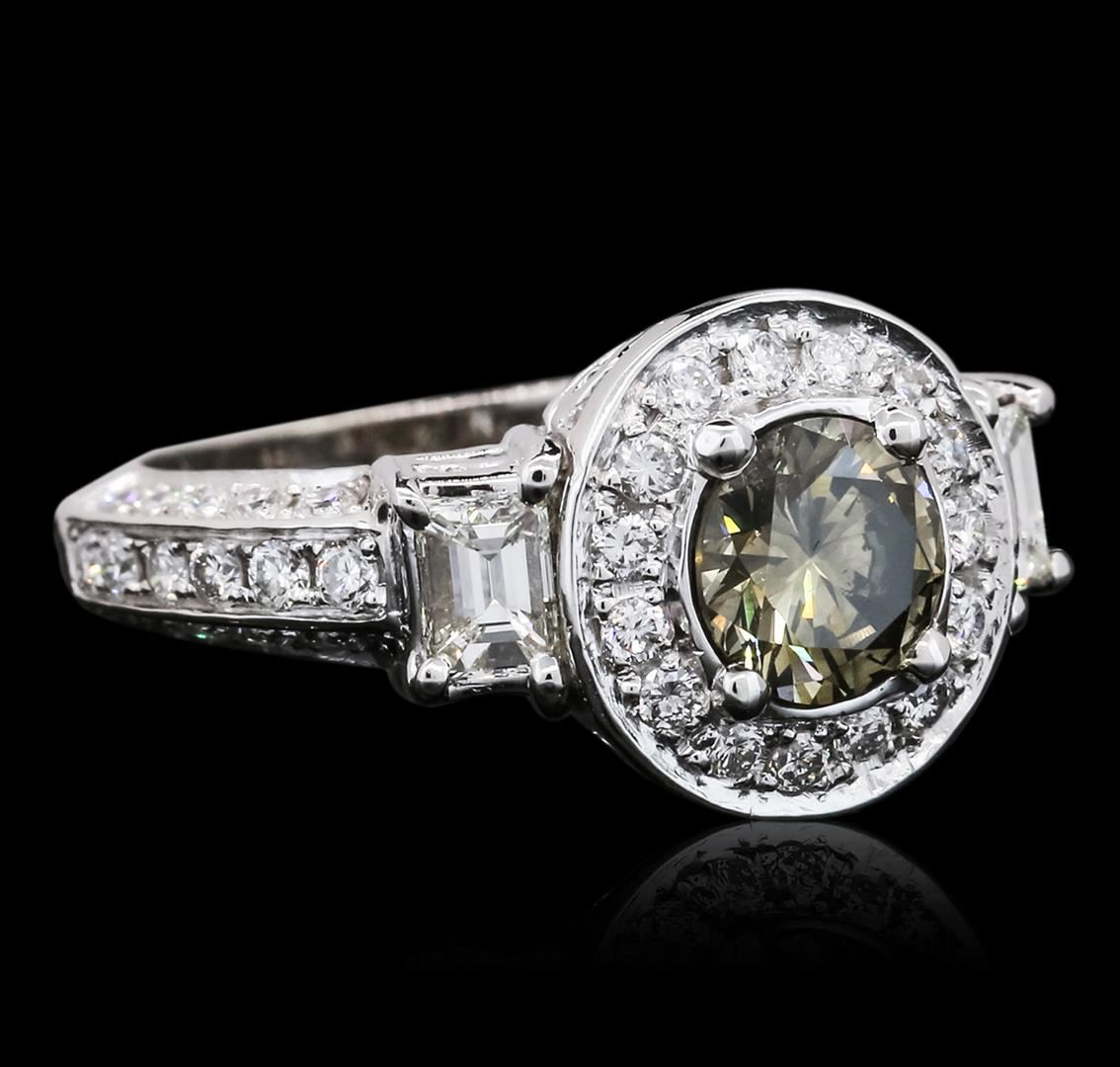 One electronically tested 10KT white gold ladies cast diamond ring with a bright polish finish. The featured diamond is set within a diamond bezel supported by diamond set shoulders, completed by a three millimeter wide band. Condition is new, good workmanship. Containing: One prong set round brilliant cut diamond, measuring 6.70 - 6.60 x 3.85mm (depth est.) approximate weight of 1.14ct. Graded in the setting. Clarity: I-1. Depth: 57.9%. Table 63.2%. Two prong set emerald shaped cut diamonds, measuring 4.30 x 3.20 x 2.20mm (depth est.) approximate total weight of 2 Stones = 0.65ct. Graded in the setting. Clarity: VS-1. Color: I Forty-Seven prong set round brilliant cut diamonds, measuring 1.80 - 1.70 x 1.05mm (depth est.) approximate total weight of 47 Stones = 1.02ct. Graded in the setting. Clarity: SI-1 to I-1. Color: G - I. Total Weight of Diamonds 2.81ct. Total Weight of Ring 7.18 grams. AIG Appraised at $12,200.00.