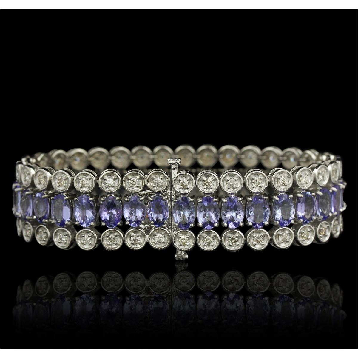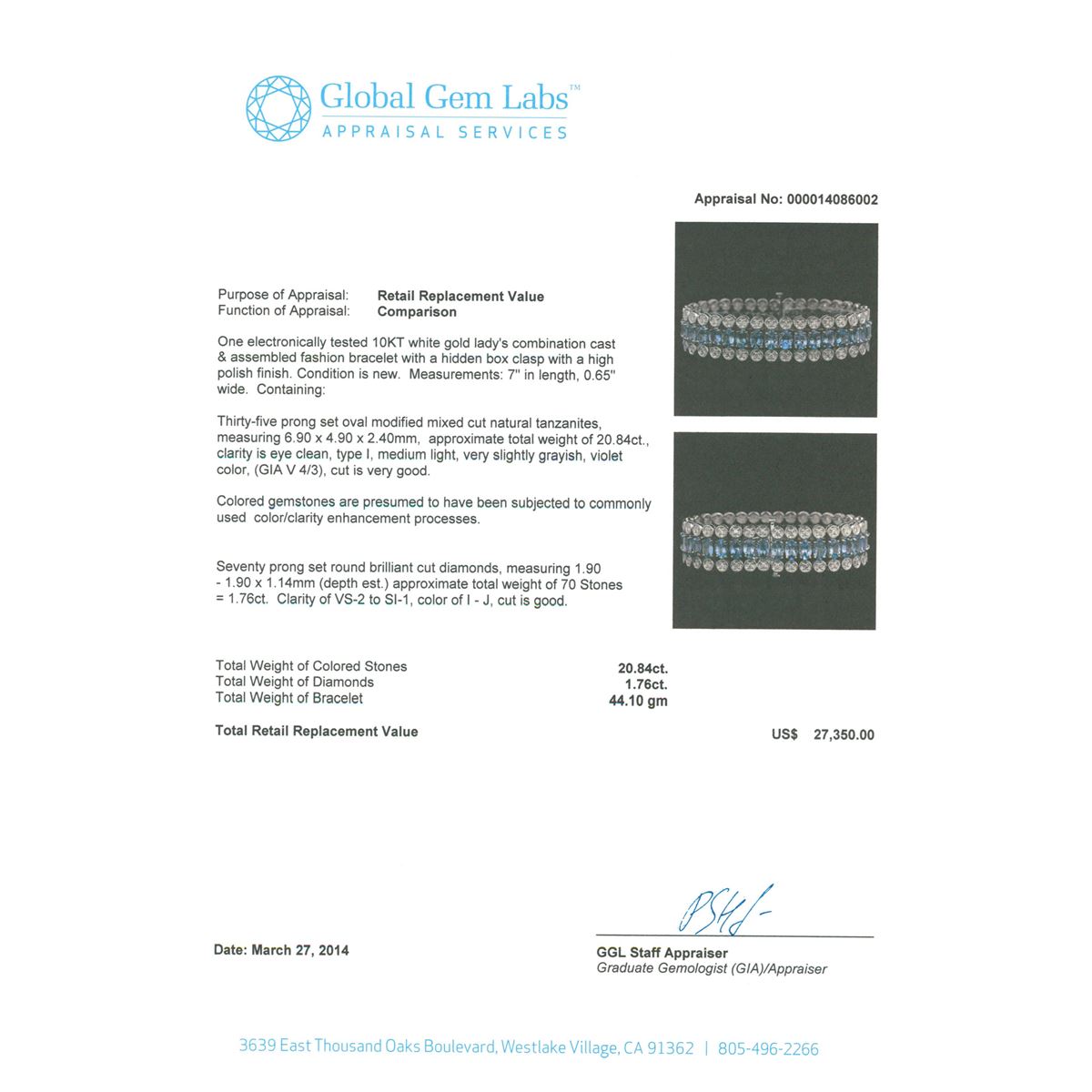 One electronically tested 10KT white gold Ladies combination cast & assembled fashion bracelet with a hidden box clasp with a high polish finish. Condition is new. Measurements: 7" in length, 0.65" wide. Containing: Thirty-five prong set oval modified mixed cut natural tanzanites, measuring 6.90 x 4.90 x 2.40mm, approximate. Total Weight of 20.84ct., clarity is eye clean, type I, medium light, very slightly grayish, violet color, (GIA V 4/3), cut is very good. Colored gemstones are presumed to have been subjected to commonly used color/clarity enhancement processes. Seventy prong set round brilliant cut diamonds, measuring 1.90 - 1.90 x 1.14mm (depth est.) approximate. Total Weight of 70 Stones = 1.76ct. Clarity: VS-2 to SI-1. Color: I - J, Cut is Good. Total Weight of Colored Stones 20.84ct. Total Weight of Diamonds 1.76ct. Total Weight of Bracelet 44.10 grams. GGL Appraised at $27,350.00.