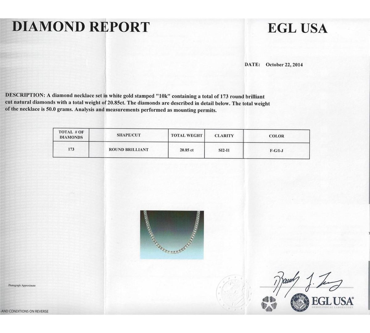 One diamond necklace set in white gold stamped 10K containing a total of 173 round brilliant cut natural diamonds with a total weight of 20.85ct. Clarity: SI2-I1. Color: F-G/I-J. The total weight of the necklace is 50.00 grams. UGS Appraised at $25,000.00.