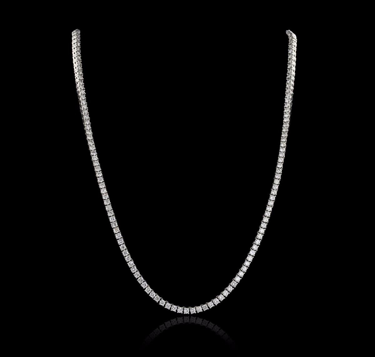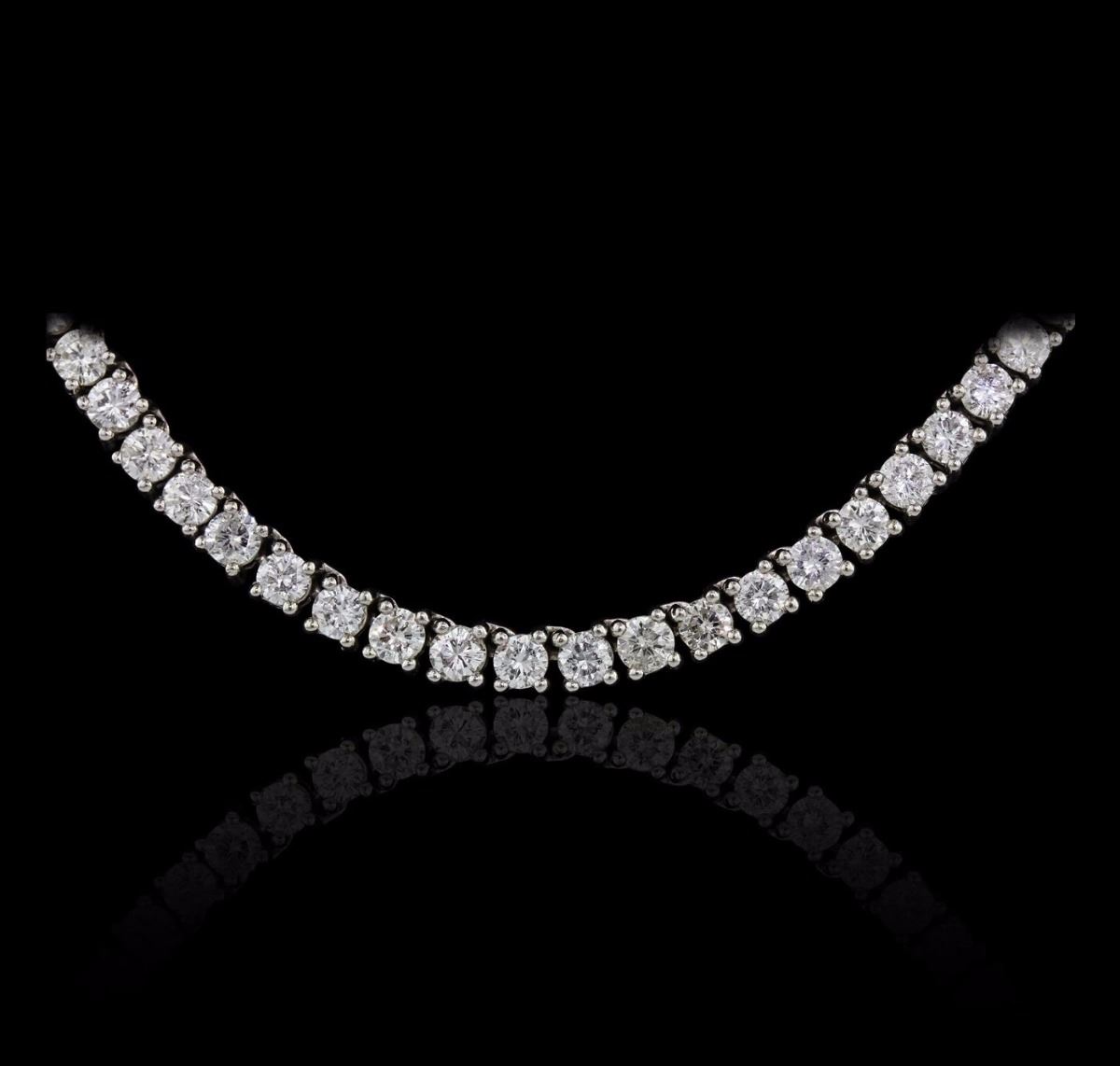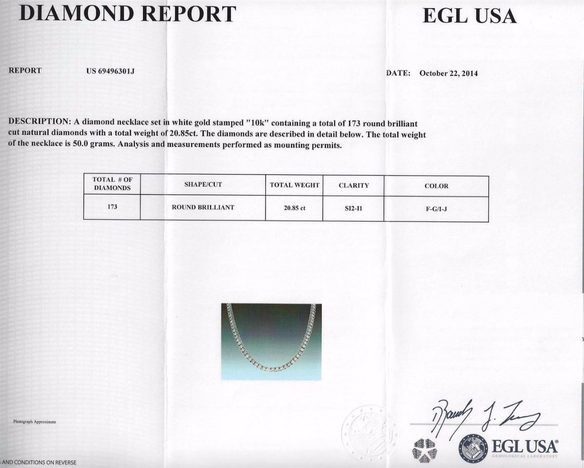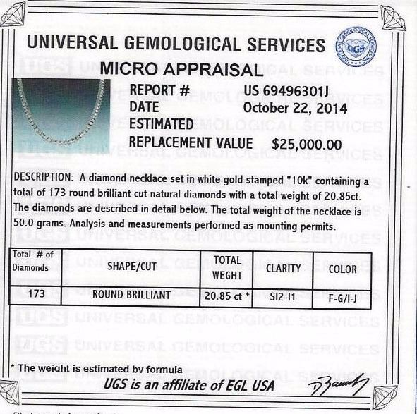 One diamond necklace set in white gold stamped 10K containing a total of 173 round brilliant cut natural diamonds with a total weight of 20.85ct. Clarity: SI2-I1. Color: F-G/I-J. The total weight of the necklace is 50.00 grams. UGS Appraised at $25,000.00.