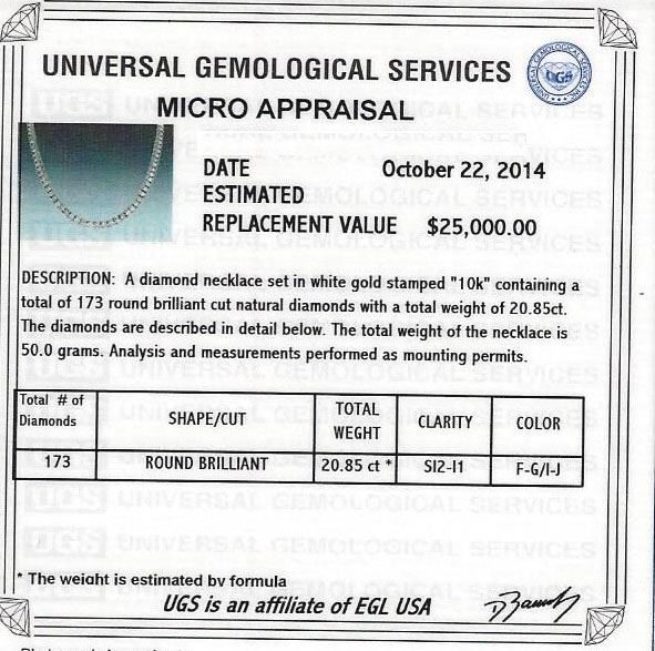 One diamond necklace set in white gold stamped 10K containing a total of 173 round brilliant cut natural diamonds with a total weight of 20.85ct. Clarity: SI2-I1. Color: F-G/I-J. The total weight of the necklace is 50.00 grams. UGS Appraised at $25,000.00.