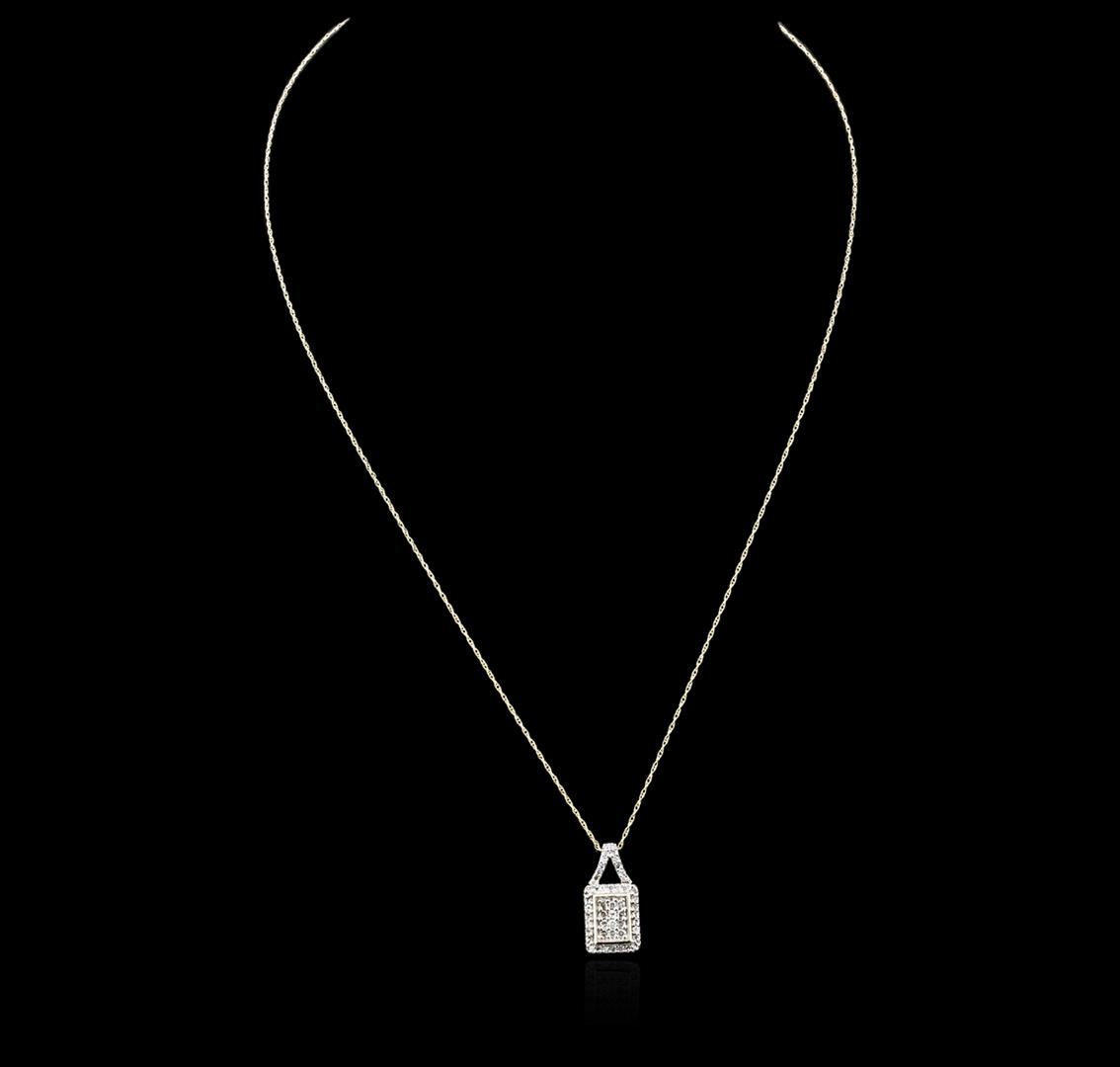 One square shaped pendant with chain featuring: 10KT yellow gold weighing 1.40 grams containing prong set round cut diamonds with a total weight of 0.25cts.