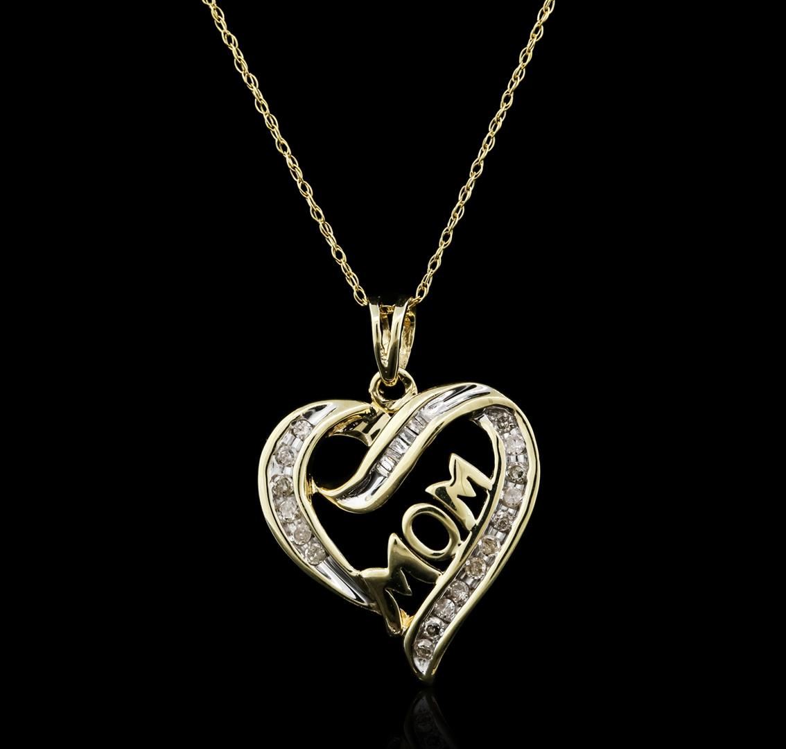 One Mom heart pendant with chain featuring: 10KT yellow gold weighing 2.00 grams containing channel set baguette cut/round cut diamonds with a total weight of 0.30cts.