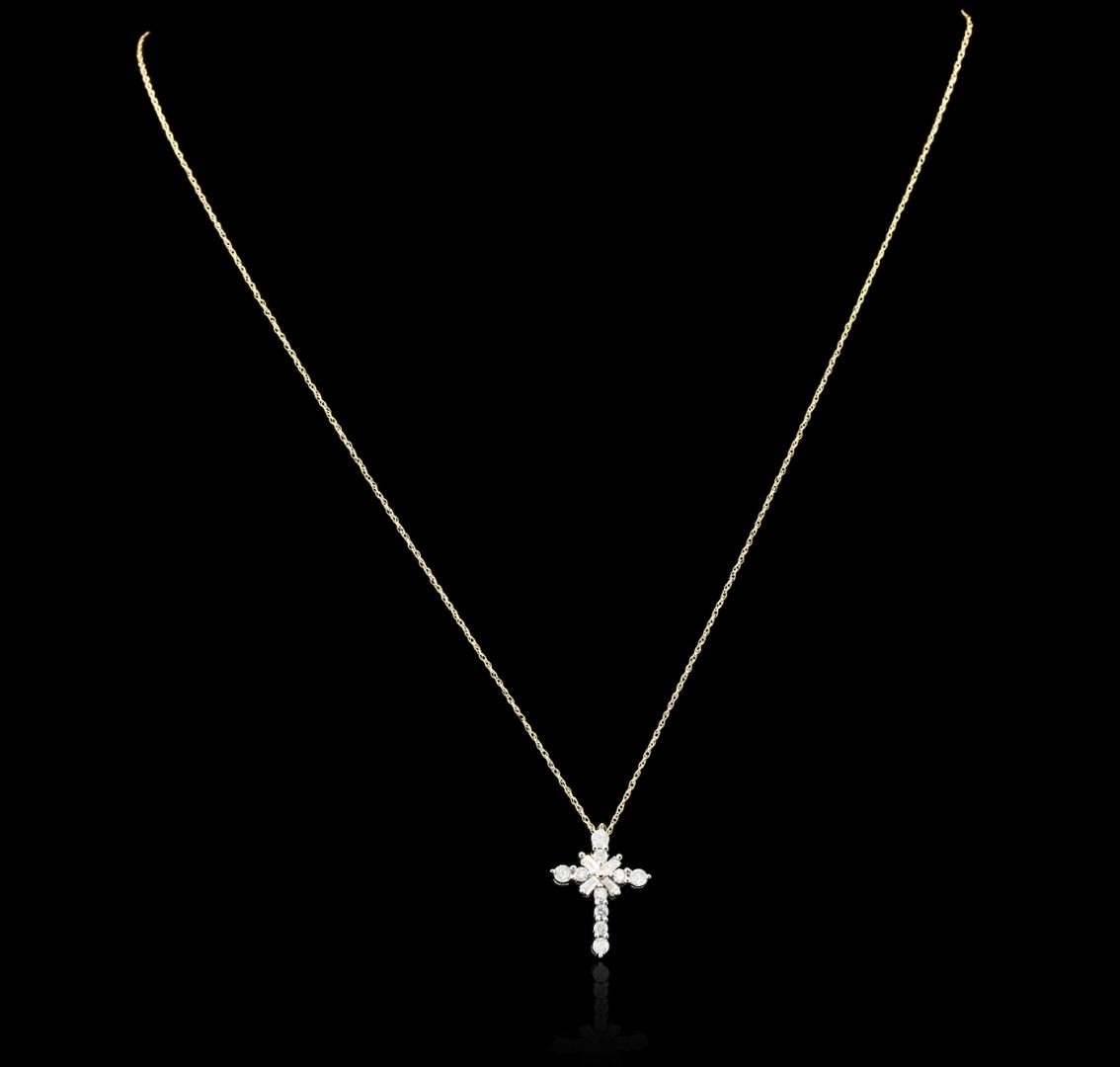 One cross pendant with chain featuring: 10KT yellow gold weighing 2.00 grams containing baguette cut/round cut diamonds with a total weight of 0.50cts.