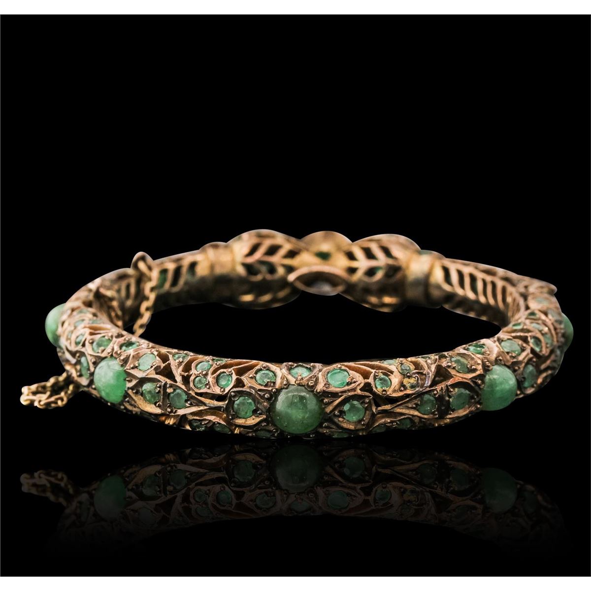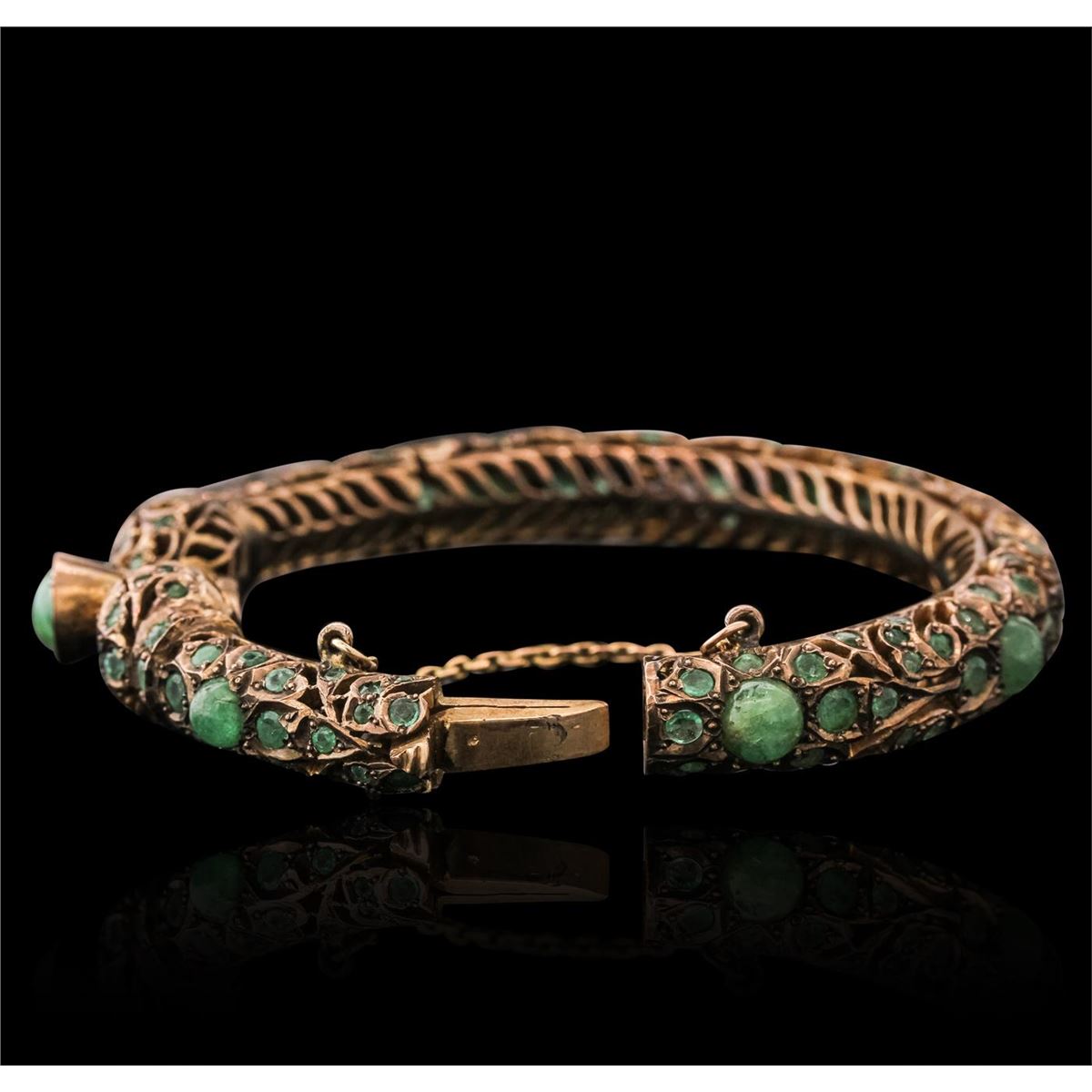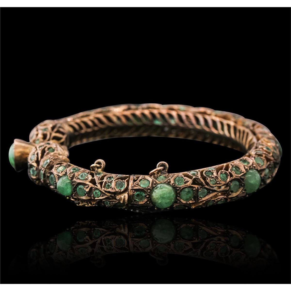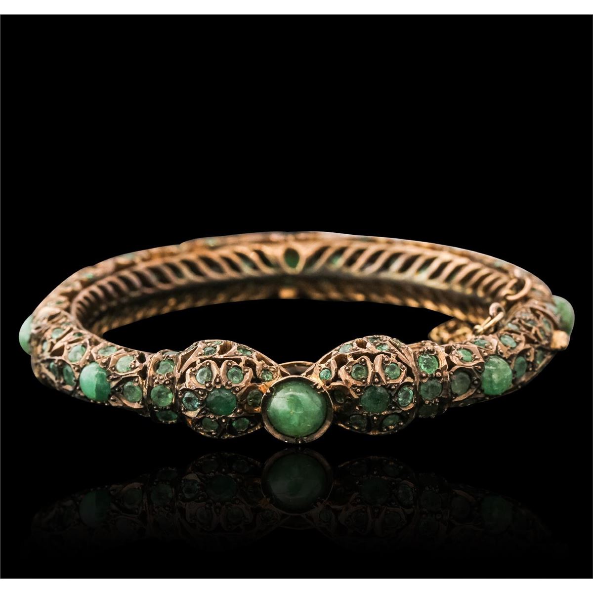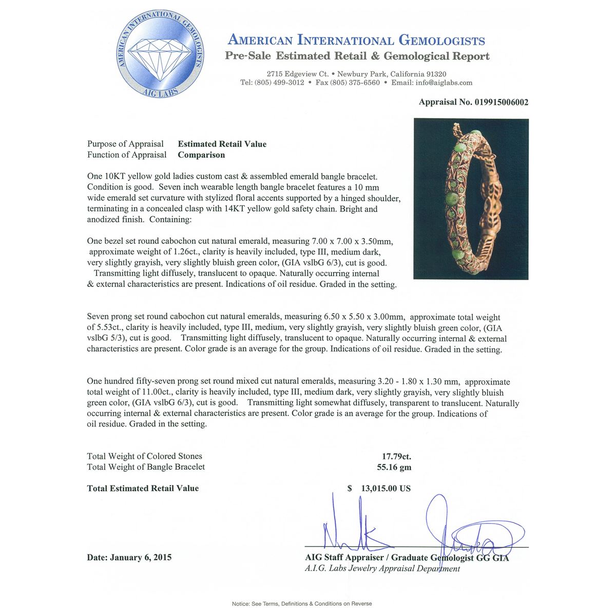 One 10KT yellow gold ladies custom cast & assembled emerald bangle bracelet. Seven inch wearable length bangle bracelet features a 10 mm wide emerald set curvature with stylized floral accents supported by a hinged shoulder, terminating in a concealed clasp with 14KT yellow gold safety chain. Bright and anodized finish. Condition is good. Containing: One bezel set round cabochon cut natural emerald, measuring 7.00 x 7.00 x 3.50mm, approximate weight of 1.26ct., clarity is heavily included, type III, medium dark, very slightly grayish, very slightly bluish green color, (GIA vslbG 6/3), cut is good. Transmitting light diffusely, translucent to opaque. Naturally occurring internal & external characteristics are present. Indications of oil residue. Graded in the setting. Seven prong set round cabochon cut natural emeralds, measuring 6.50 x 5.50 x 3.00mm, approximate. Total Weight of 5.53ct., clarity is heavily included, type III, medium, very slightly grayish, very slightly bluish green color, (GIA vslbG 5/3), cut is good. Transmitting light diffusely, translucent to opaque. Naturally occurring internal & external characteristics are present. Color grade is an average for the group. Indications of oil residue. Graded in the setting. One hundred fifty-seven prong set round mixed cut natural emeralds, measuring 3.20 - 1.80 x 1.30 mm, approximate. Total Weight of 11.00ct., clarity is heavily included, type III, medium dark, very slightly grayish, very slightly bluish green color, (GIA vslbG 6/3), cut is good. Transmitting light somewhat diffusely, transparent to translucent. Naturally occurring internal & external characteristics are present. Color grade is an average for the group. Indications of oil residue. Graded in the setting. Total Weight of Colored Stones 17.79ct. Total Weight of Bangle Bracelet 55.16 grams. AIG Appraised at $13,015.00.