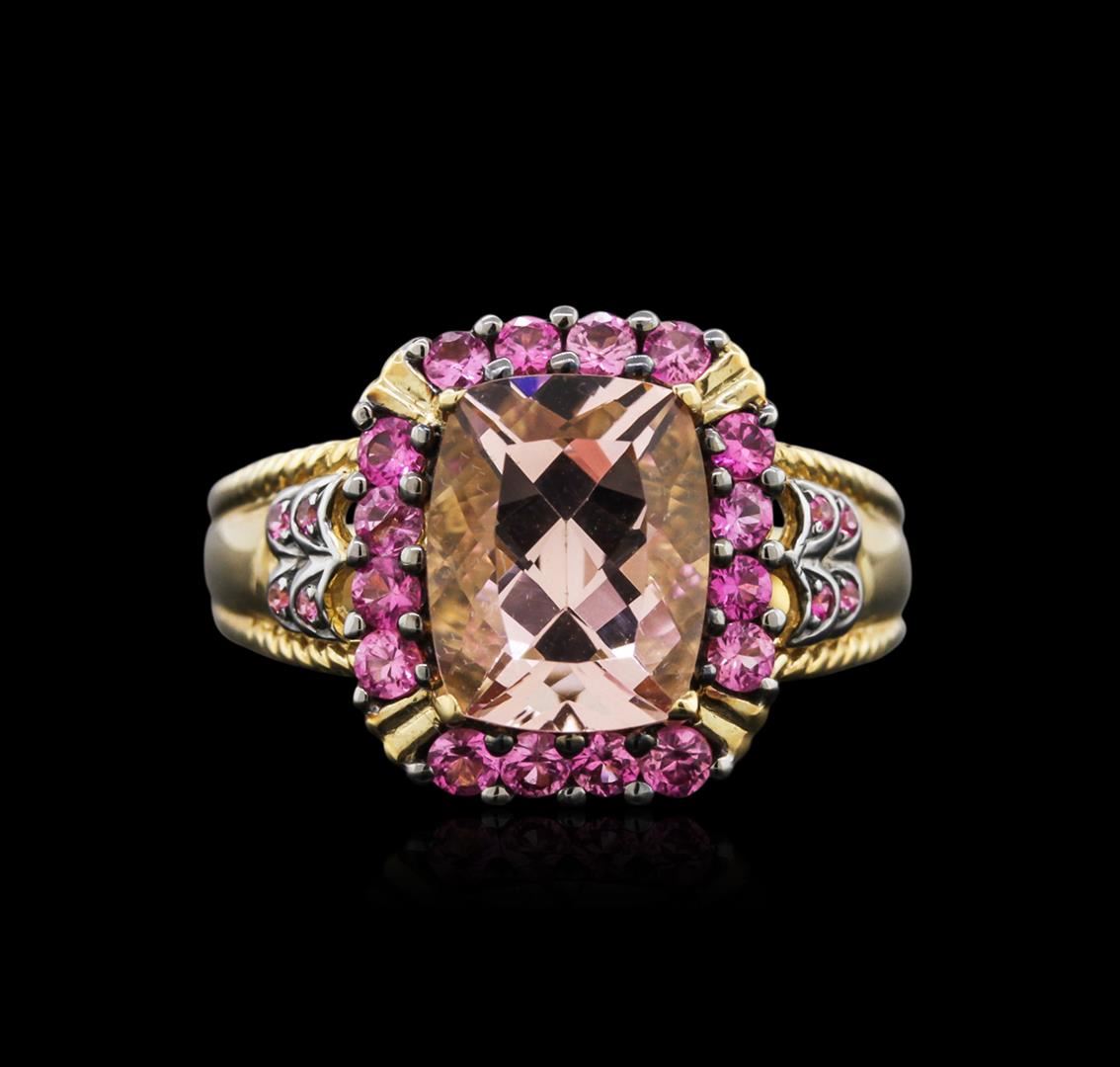 One ring featuring: 10KT yellow gold weighing 3.70 grams containing one morganite center stone with a total weight of 3.02ct and 24 pink sapphires with a total weight of 0.73ct.