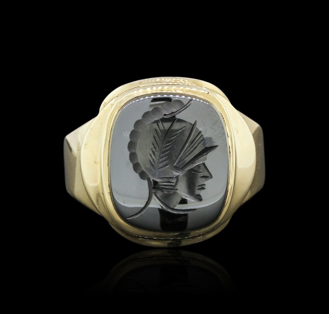 One electronically tested 10KT yellow gold mens cast hematite ring with a bright polish finish. Identified with markings of "10K". Condition is very good. Containing: One bezel set intaglio cut natural hematite, measuring 15.60 x 13.60 x 2.70mm, approximate weight of 5.90ct., black, vivid, black color, (GIA Bl 10/6), cut is very good. Colored gemstones are presumed to have been subjected to commonly used enhancement processes. Total Weight of Colored Stones 5.90ct. Total Weight of Ring 12.10 grams. GGL Appraised at $2,030.00.