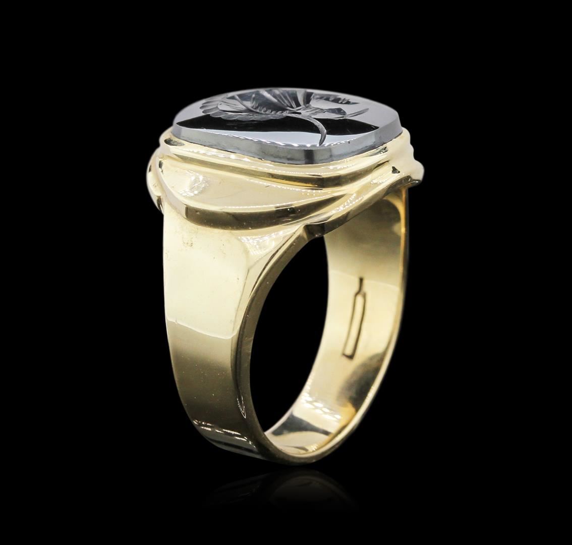 One electronically tested 10KT yellow gold mens cast hematite ring with a bright polish finish. Identified with markings of "10K". Condition is very good. Containing: One bezel set intaglio cut natural hematite, measuring 15.60 x 13.60 x 2.70mm, approximate weight of 5.90ct., black, vivid, black color, (GIA Bl 10/6), cut is very good. Colored gemstones are presumed to have been subjected to commonly used enhancement processes. Total Weight of Colored Stones 5.90ct. Total Weight of Ring 12.10 grams. GGL Appraised at $2,030.00.