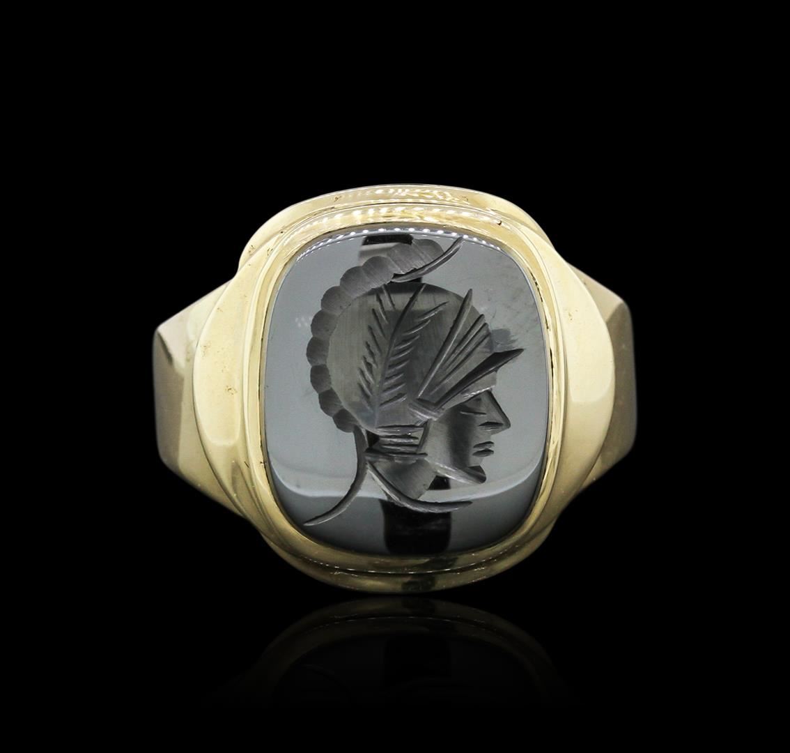 One electronically tested 10KT yellow gold mens cast hematite ring with a bright polish finish. Identified with markings of "10K". Condition is very good. Containing: One bezel set intaglio cut natural hematite, measuring 15.60 x 13.60 x 2.70mm, approximate weight of 5.90ct., black, vivid, black color, (GIA Bl 10/6), cut is very good. Colored gemstones are presumed to have been subjected to commonly used enhancement processes. Total Weight of Colored Stones 5.90ct. Total Weight of Ring 12.10 grams. GGL Appraised at $2,030.00.