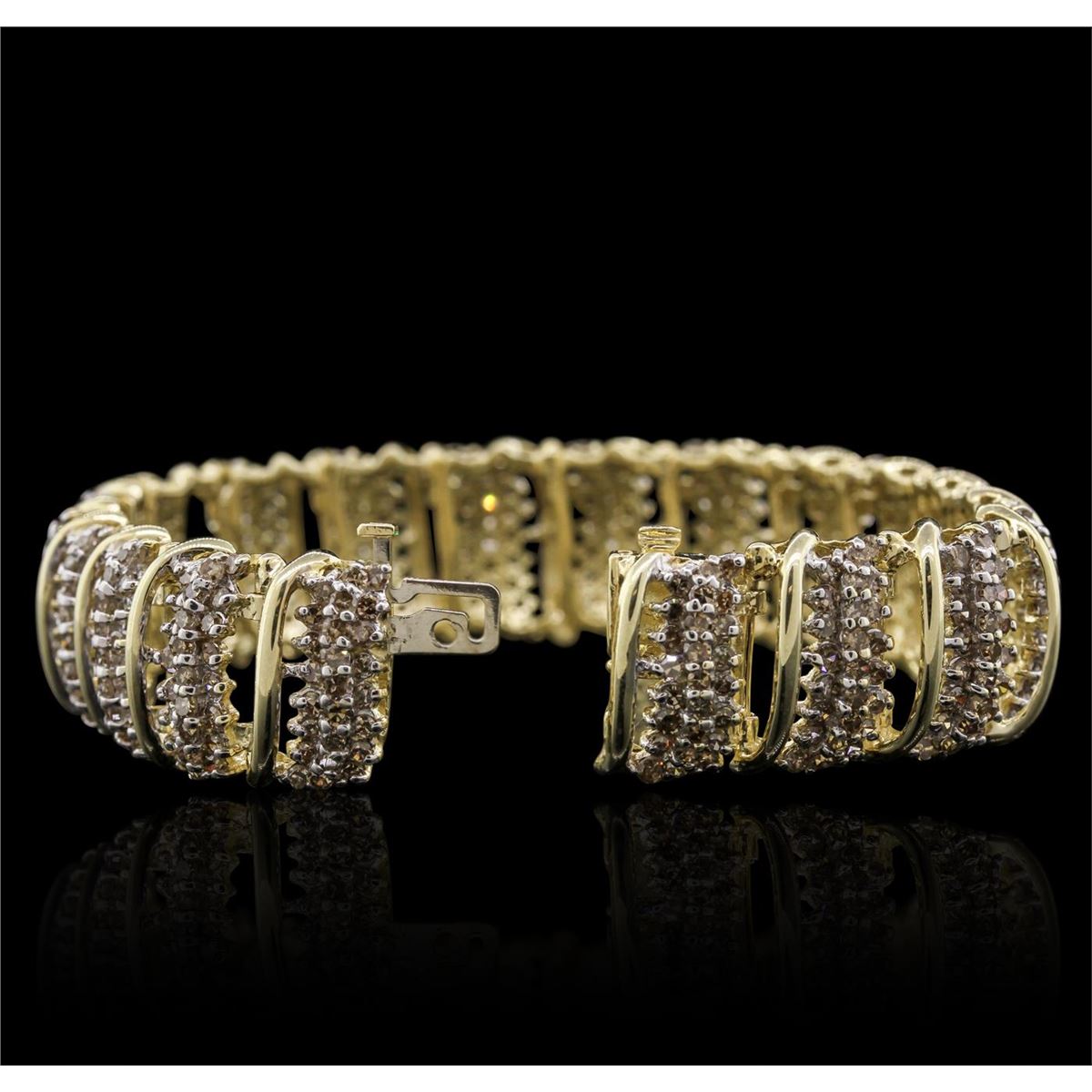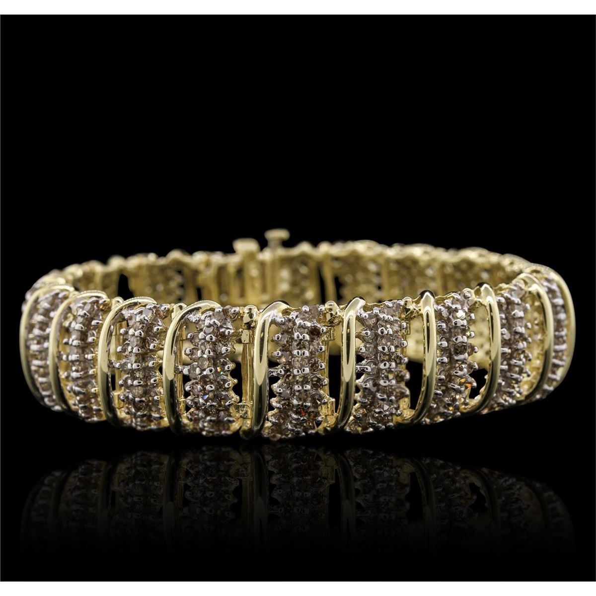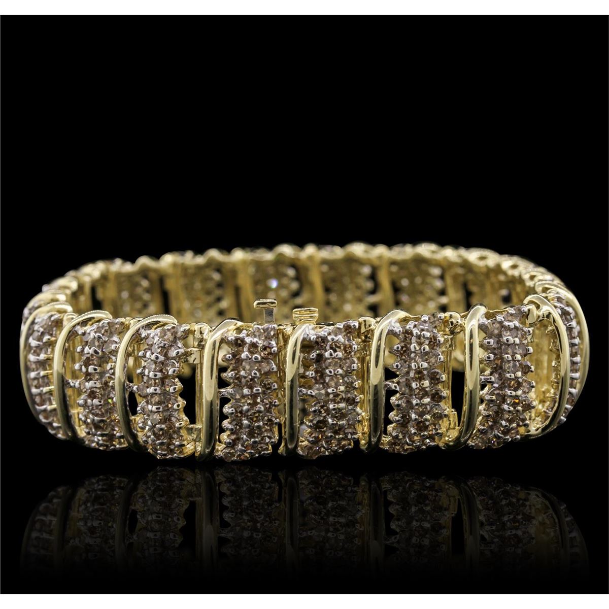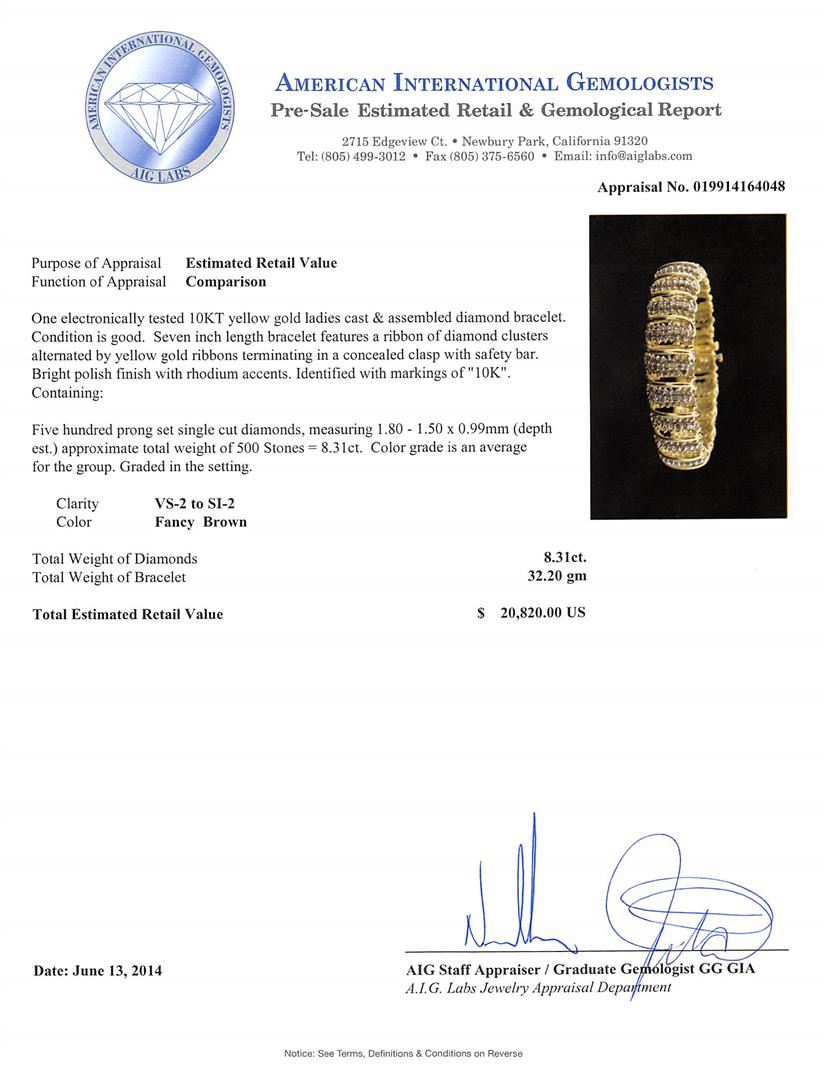 One electronically tested 10KT yellow gold ladies cast & assembled diamond bracelet. Condition is good. Seven inch length bracelet features a ribbon of diamond clusters alternated by yellow gold ribbons terminating in a concealed clasp with safety bar. Bright polish finish with rhodium accents. Identified with markings of "10K". Containing: Five Hundred prong set single cut diamonds, measuring 1.80 - 1.50 x 0.99mm (depth est.) approximate. Total Weight of 500 Stones = 8.31ct. Color grade is an average for the group. Graded in the setting. Clarity: VS-2 to SI-2. Total Weight of Diamonds 8.31ct. Total Weight of Bracelet 32.20 grams. AIG Appraised at $20,820.00.