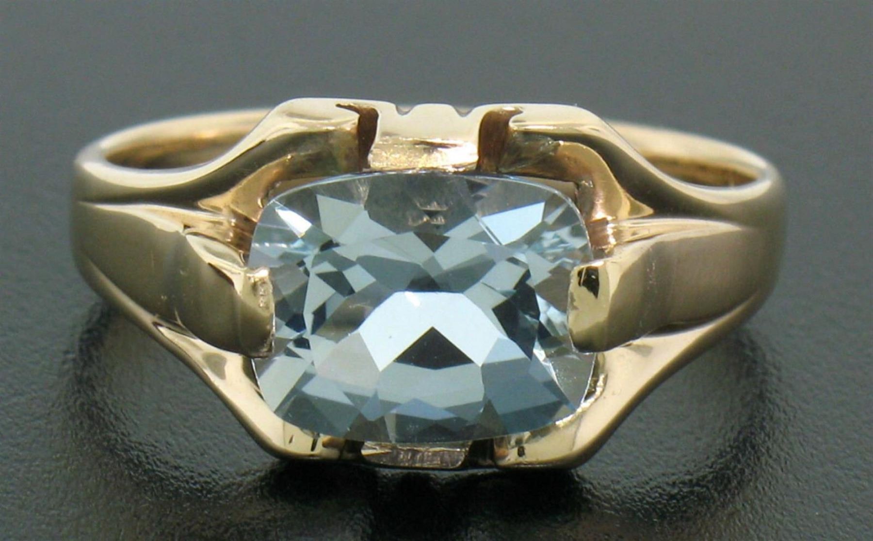 One Vintage 10k Solid Gold Cushion Cut Horizontal Aquamarine Solitaire Ladies Ring. Item Details - Material: Solid 10K Yellow Gold, Weight: 4.80 Grams , Stone(s): (1) Natural Genuine Aquamarine - Cushion Cut - Prong Set - Crystal Clear Light Blue - 10.36x8.16mm - 2.50 ct (approx.), Size: 9.0, Dimensions: Measures 11.60mm side to side by 10.23mm top to bottom, Condition: Vintage estate piece in excellent condition.