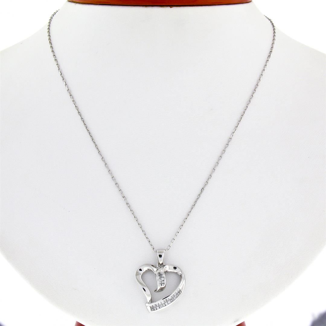 A 10k white gold open heart pendant featuring 34 channel set square princess cut diamonds (G/H - VS2/SI1; 0.25ctw). 16 inch 14k white gold cable link chain, 3.00 grams total weight, pendant measures 22.00x17.45mm.