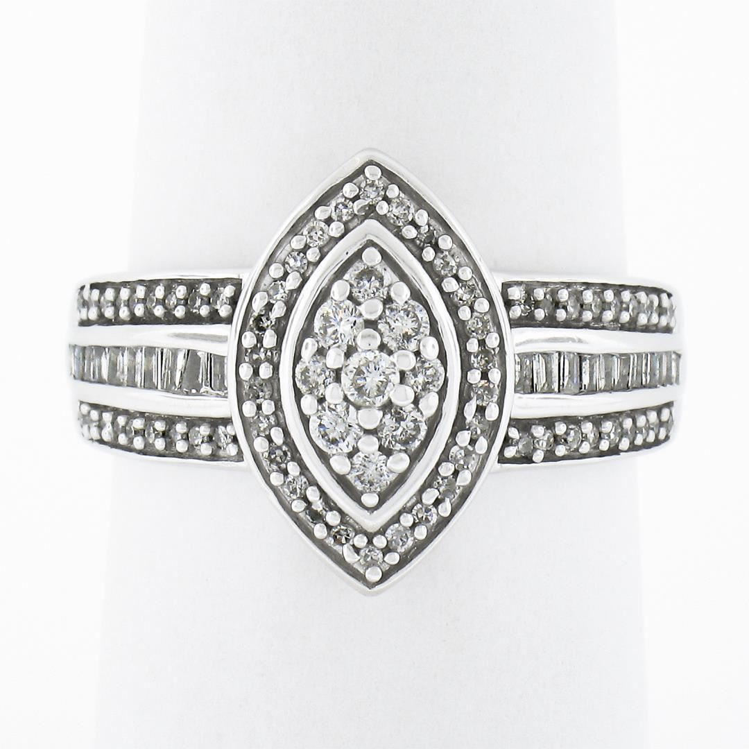 A solid 10k white gold ring, with 71 round brilliant cut natural diamonds (H/I - SI2-I2 ; 0.34ctw), and 22 baguette cut natural diamonds (H/I - SI2-I2 ; 0.44ctw). The ring is size 6.5, weighs a total of 4.10 grams, and measures 14.3mm wide.