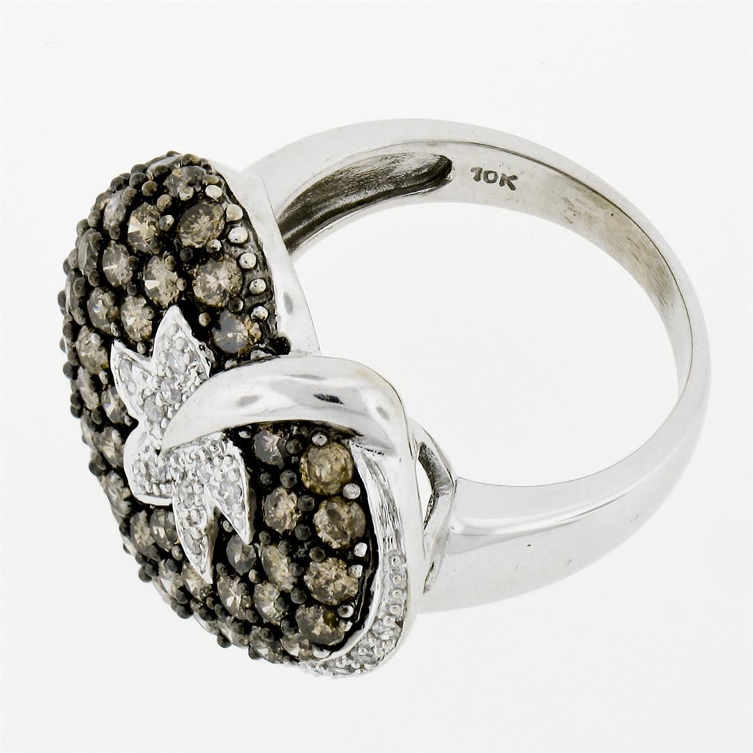 A 10k white gold leaf and heart motif ring with 2.85ctw of prong set round brilliant fancy light brown diamonds (SI2/I1) accented by an additional 0.25ctw of pave set round brilliant white diamonds (H - I1/I2). The ring is size 7.0, weighs a total of 8.28 grams, and measures 21.0mm wide.